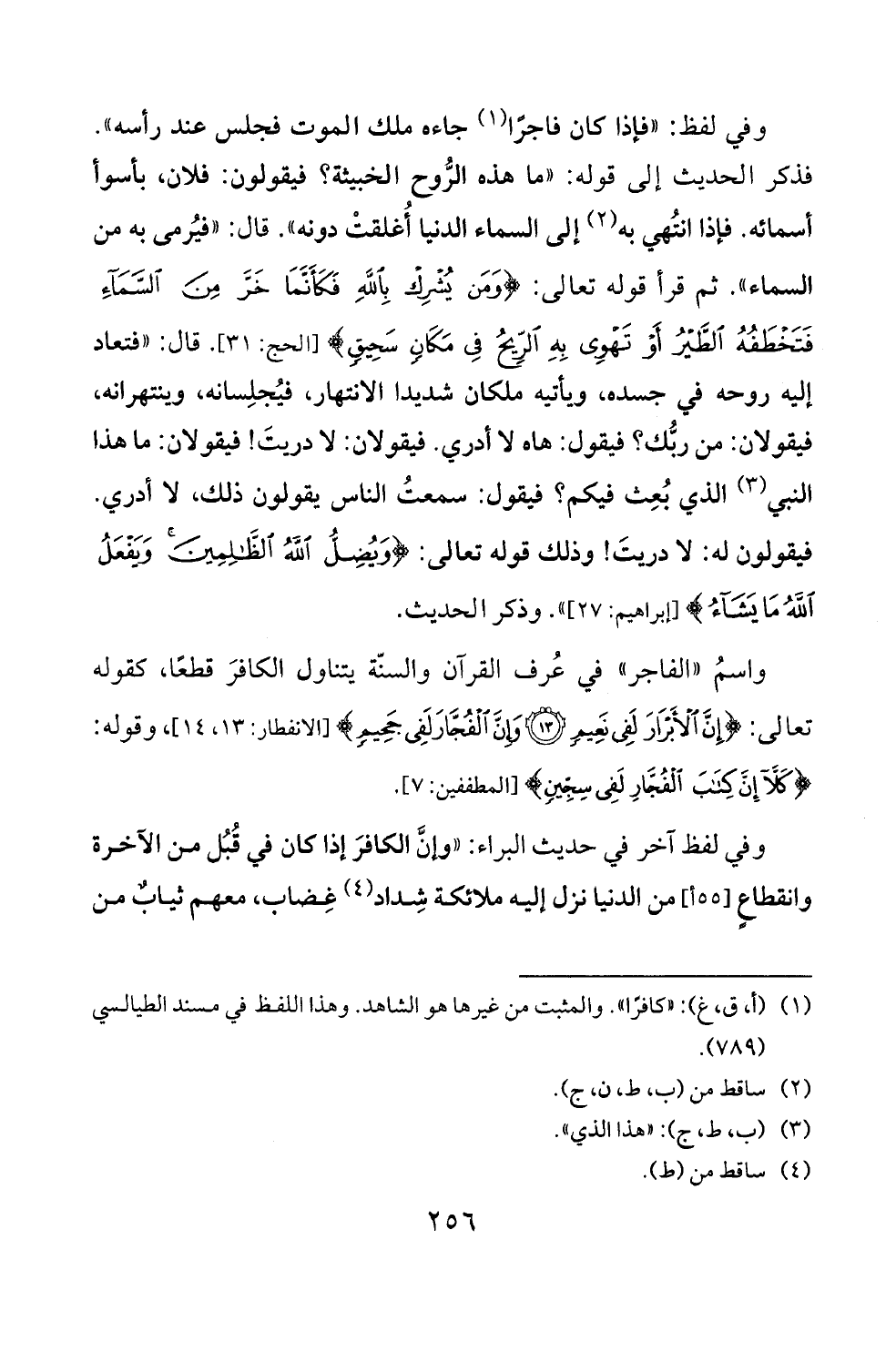 وفي لفط: "فاذا كان فاجرا (1) جاءه ملك الموت فجلس عند رأسه ".