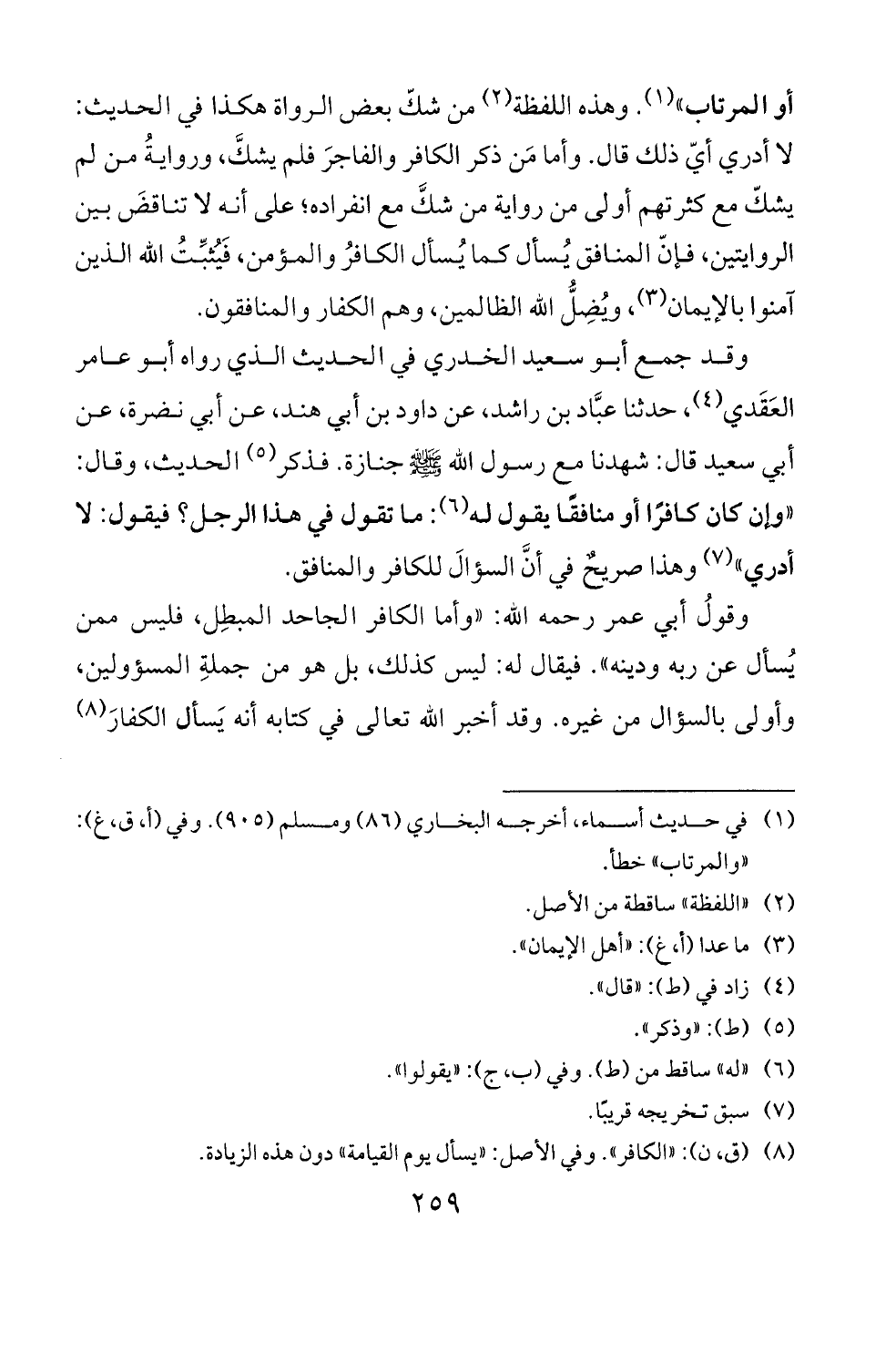 "وان كان كافرا أو منافقا يقول له (6): ما تقول في هذا الرجل؟ فيقول: لا