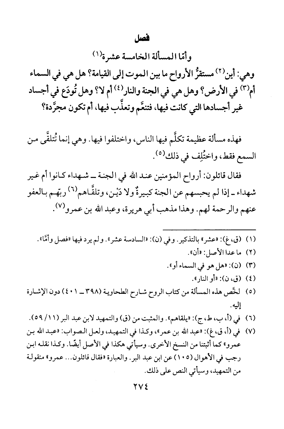 (5) لخص هذه المسألة من كتاب الروح شارح الطحاوية (398 - 1 0 4) دون الاشارة