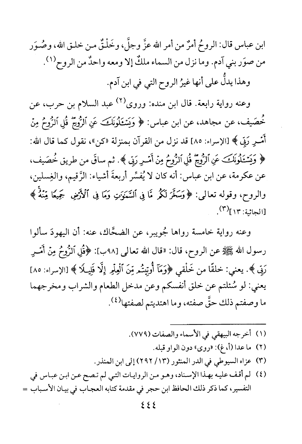 ابن عباس قال: الروح أمر من أمر الله عز وجل، وخلق من خلق الله، وصور