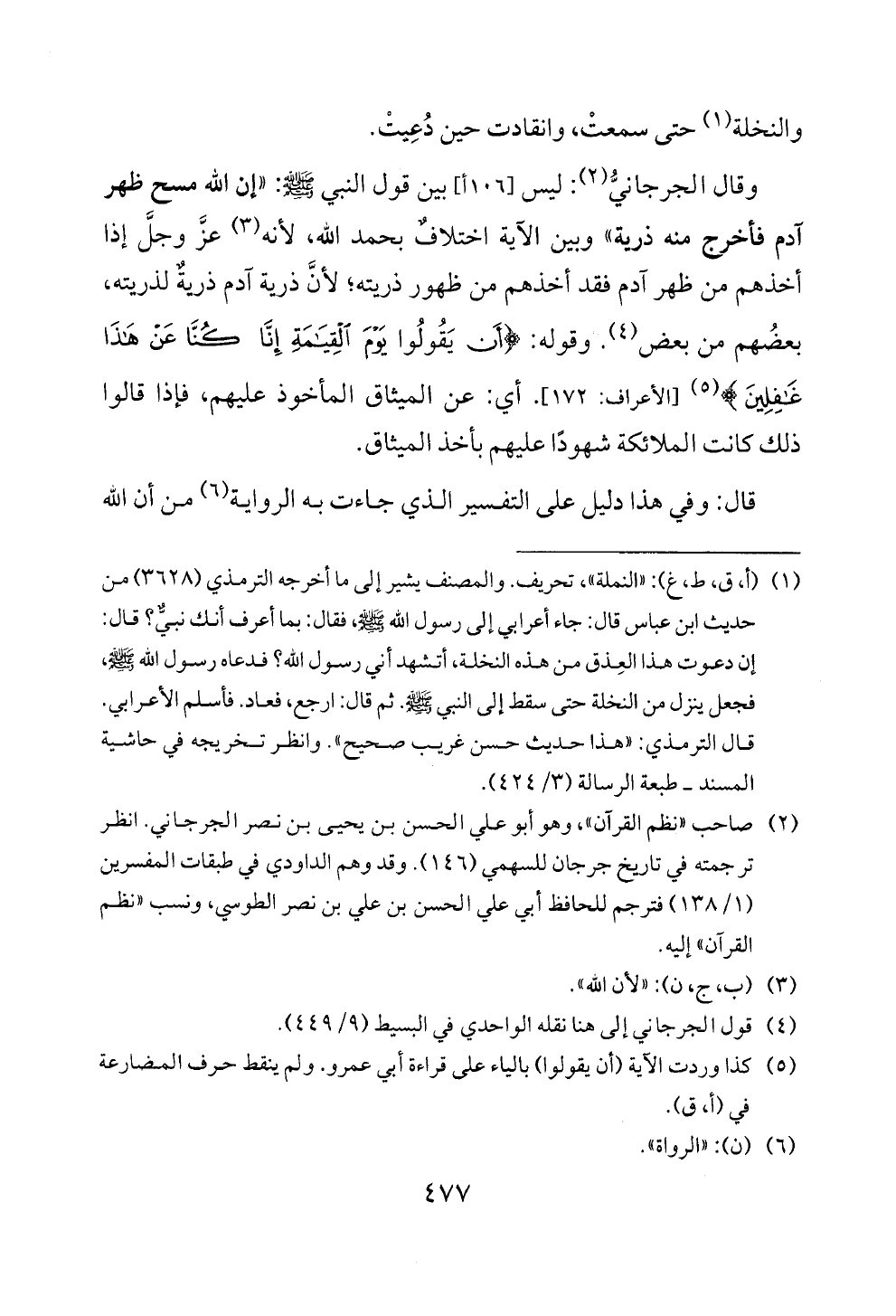 وقال الجرجاني (2): ليس [106 ا] بين قول النبي! يم: "ان الله مسح ظهر