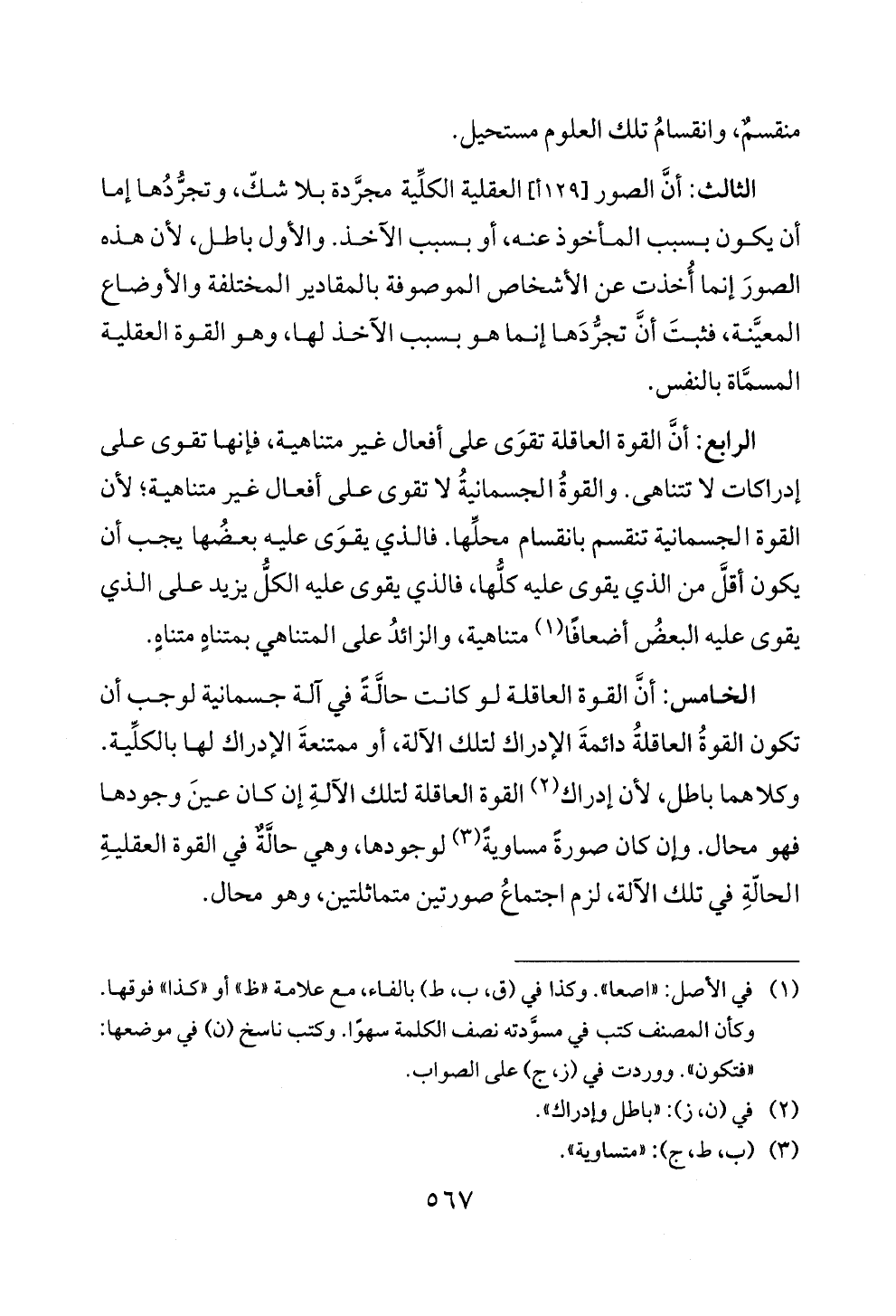 الثالث: أن الصور [129 ا] العقلية الكلية مجردة بلا شك، وتجردها إما
