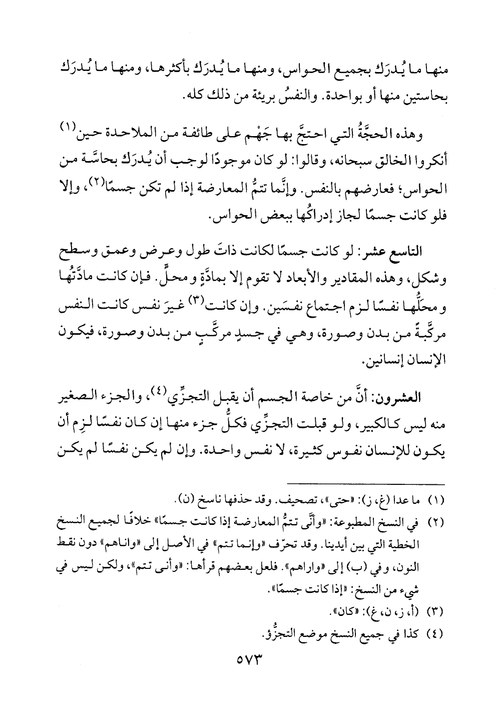 الحواس؛ فعارضهم بالنفس. وإنما تتم المعارضة إذا لم تكن جسما (2)، والا
