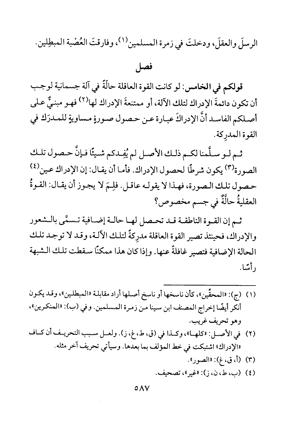 انكر ايضا إخر ج المصنف ابن سينا من زمرة المسلمين. وفي (ب): "المنكرين "،