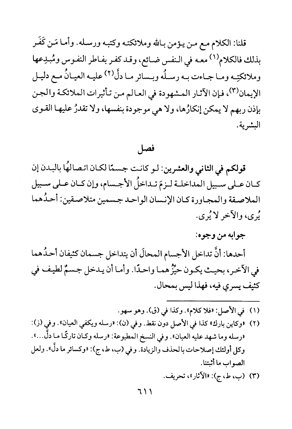 أحدها: أن تداخل الاجسام المحال أن يتداخل جسمان كثيفان أحدهما