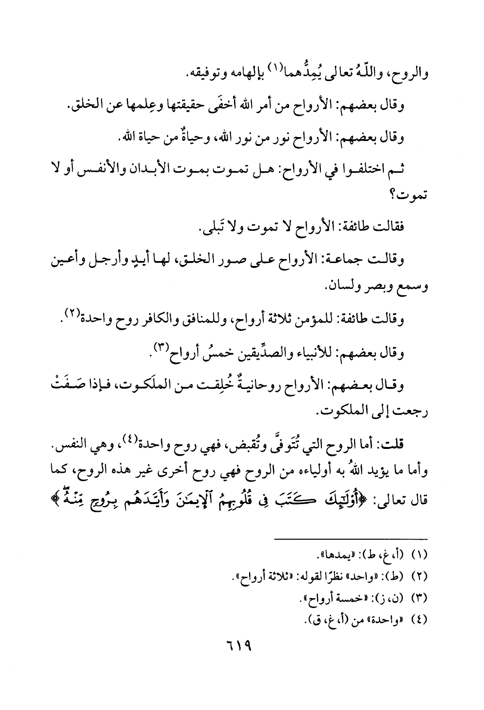 وقالت طائفة: للمومن ثلاثة أرواح، وللمنافق والكافر روح واحدة (2).