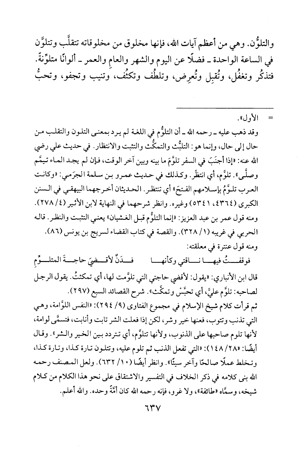 وقد ذهب عليه - رحمه الله - أن التلوم في اللغة لم يرد بمعنى التلون والتقلب من