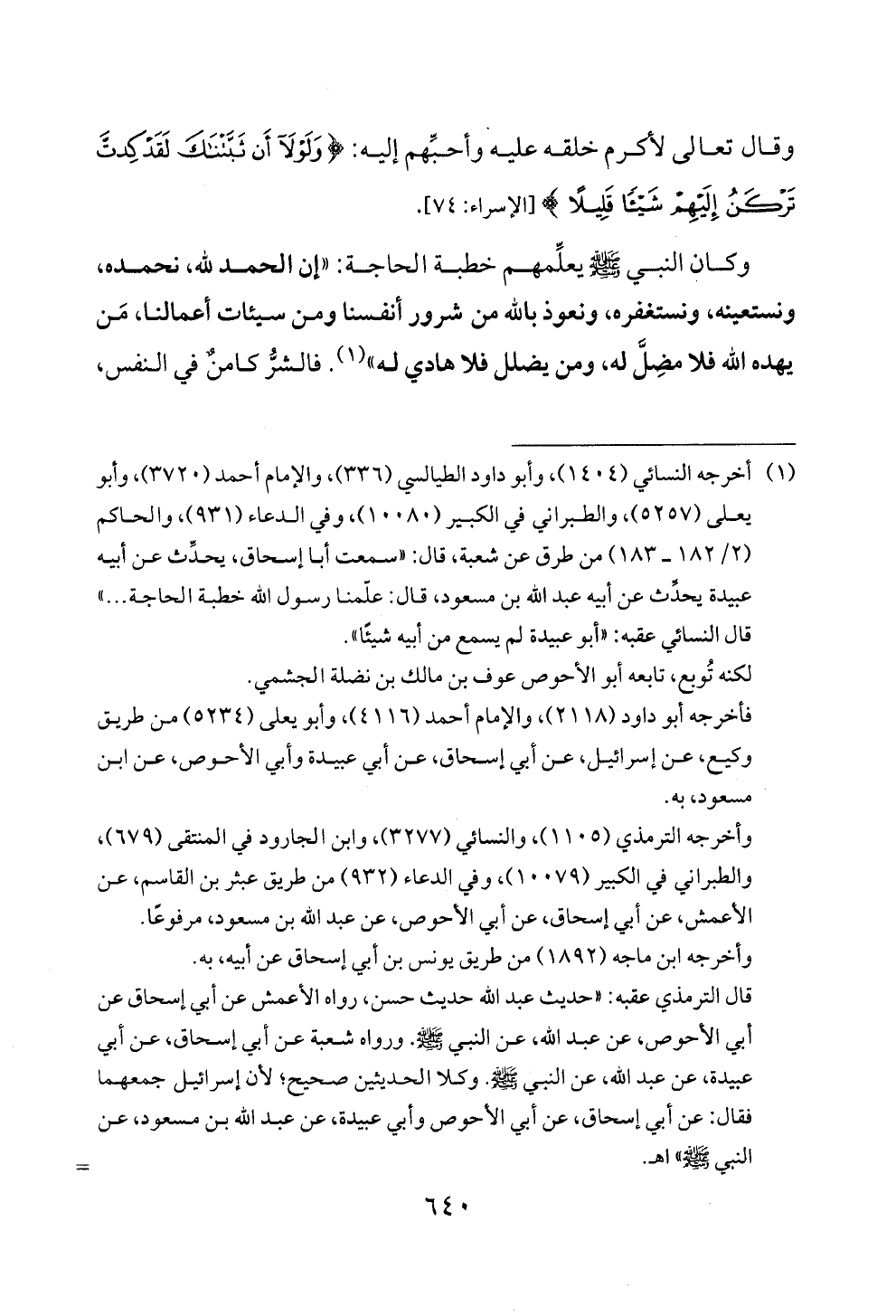 عبيدة يحدث عن أبيه عبد الله بن مسعود، قال: علمنا رسول الله خطبة لحاجة ... "