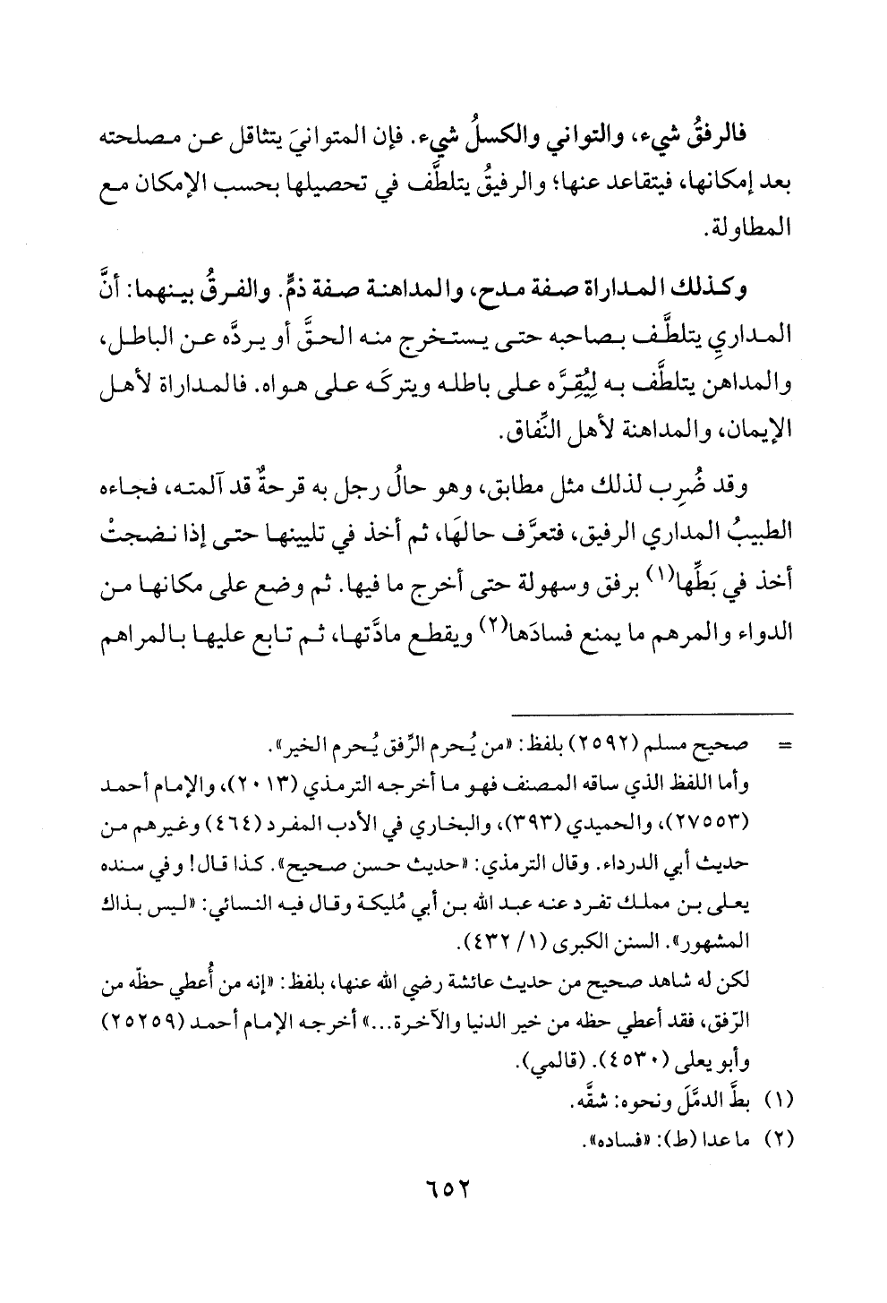 وكذلك ا لمداراة صفة مدح، وا لمداهنة صفة ذم. والفرق بينهما: ا ن