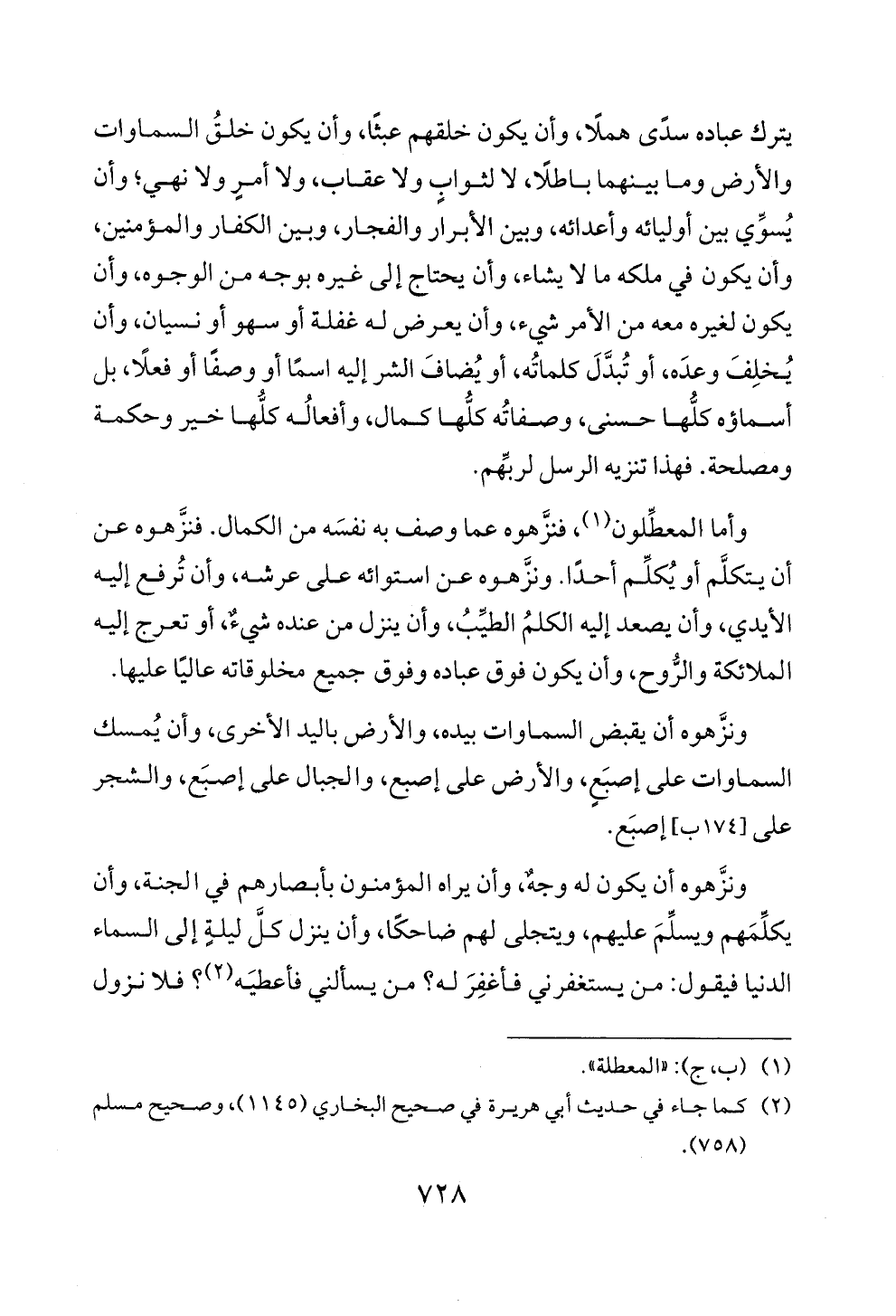 وأما المعطلون (1)، فنزهوه عما وصف به نفسه من الكمال. فتزهوه عن