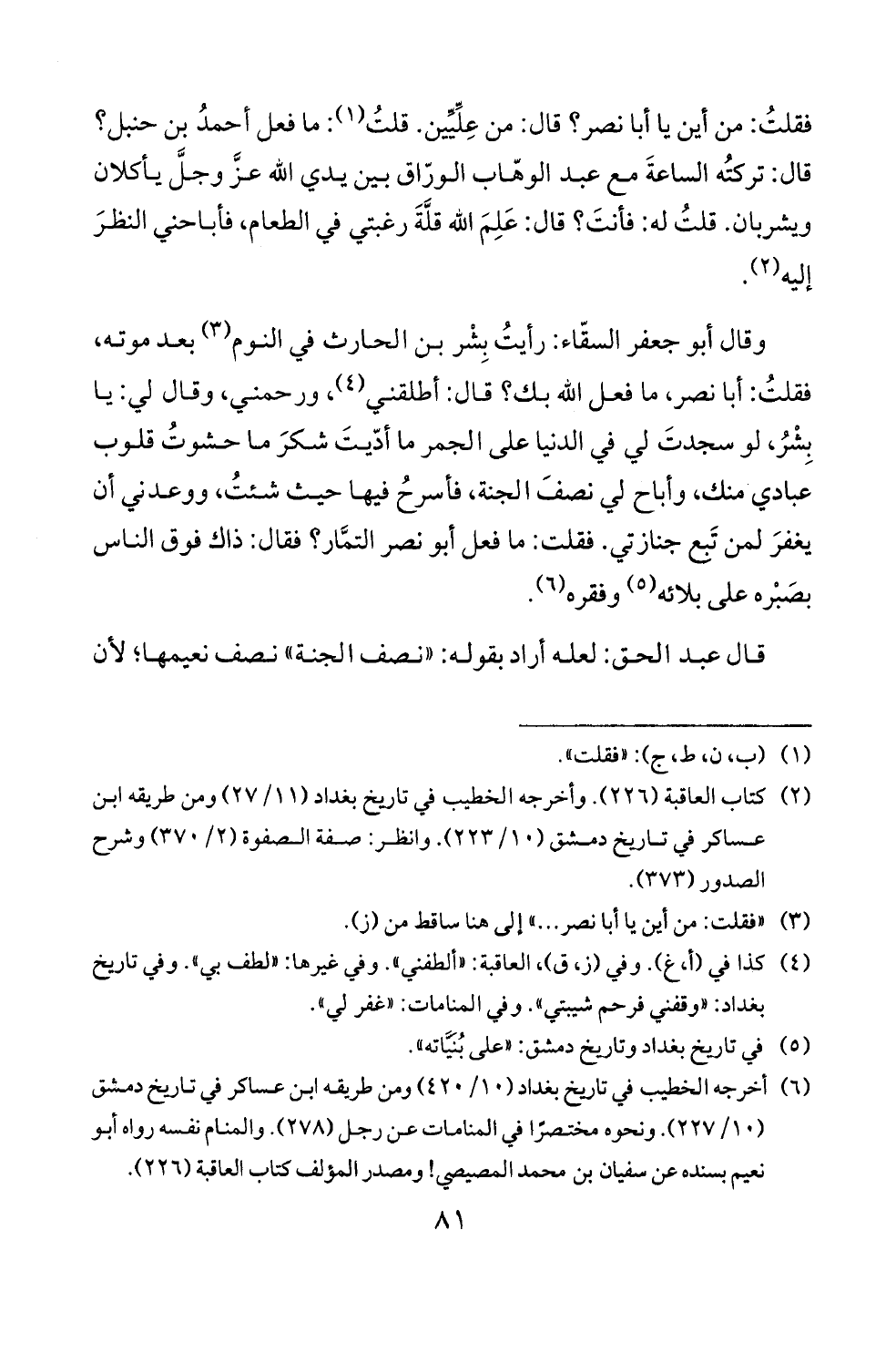 فقلت: من أين يا أبا نصر؟ قال: من عليين. قلت (1): ما فعل احمد بن حنبل؟