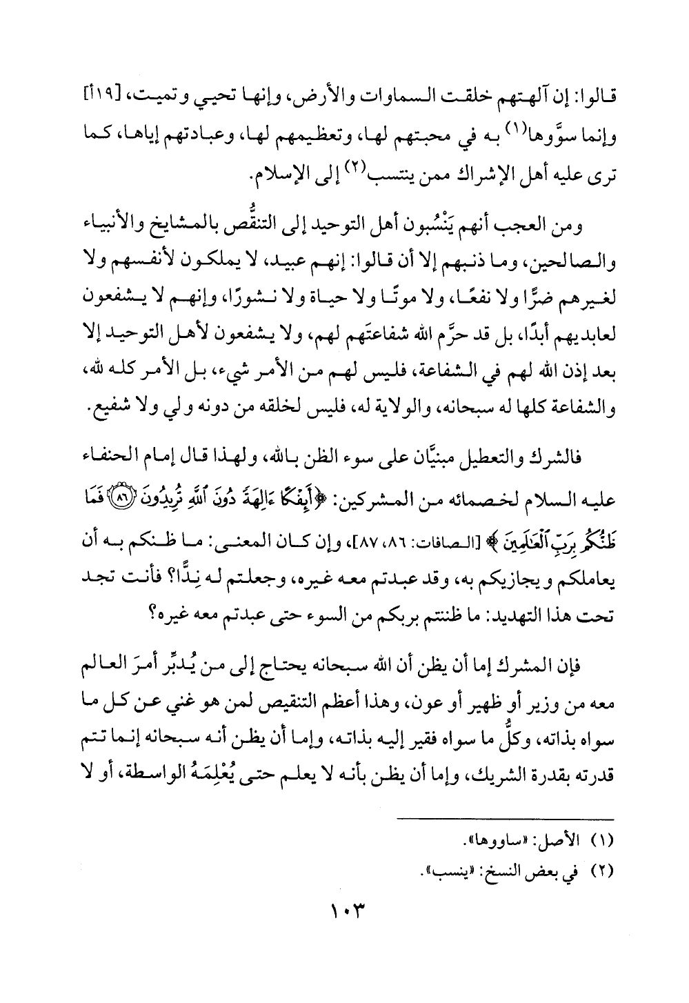 قالو ا: إن آلهتهم خلقت السماوات والأرض، وإنها تحيي وتميت، وإنما سوَّوها (¬1) به في محبتهم لها، وتعظيمهم لها، وعبادتهم إياها، كما ترى عليه أهل الإشراك ممن ينتسب (¬2) إلى الإسلام.