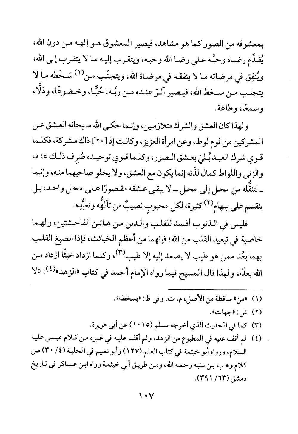 ولهذا كان العشق والشرك متلازمين، وإنما حكى الله سبحانه العشق عن المشركين من قوم لوط، وعن امرأة العزيز، وكانت إذ ذاك مشركة، فكلما قوي شرك العبد بُليَ بعشق الصور، وكلما قوي توحيده صُرِف ذلك عنه، والزنى واللواط كمال لذّته إنما يكون مع العشق، ولا يخلو صاحبهما منه، وإنما -لتنقُّله من محل إلى محل- لا يبقى عشقه مقصورًا على محل واحد، بل ينقسم على سِهام (¬2) كثيرة، لكل محبوب نصيبٌ من تألهُّه وتعبُّدِه.