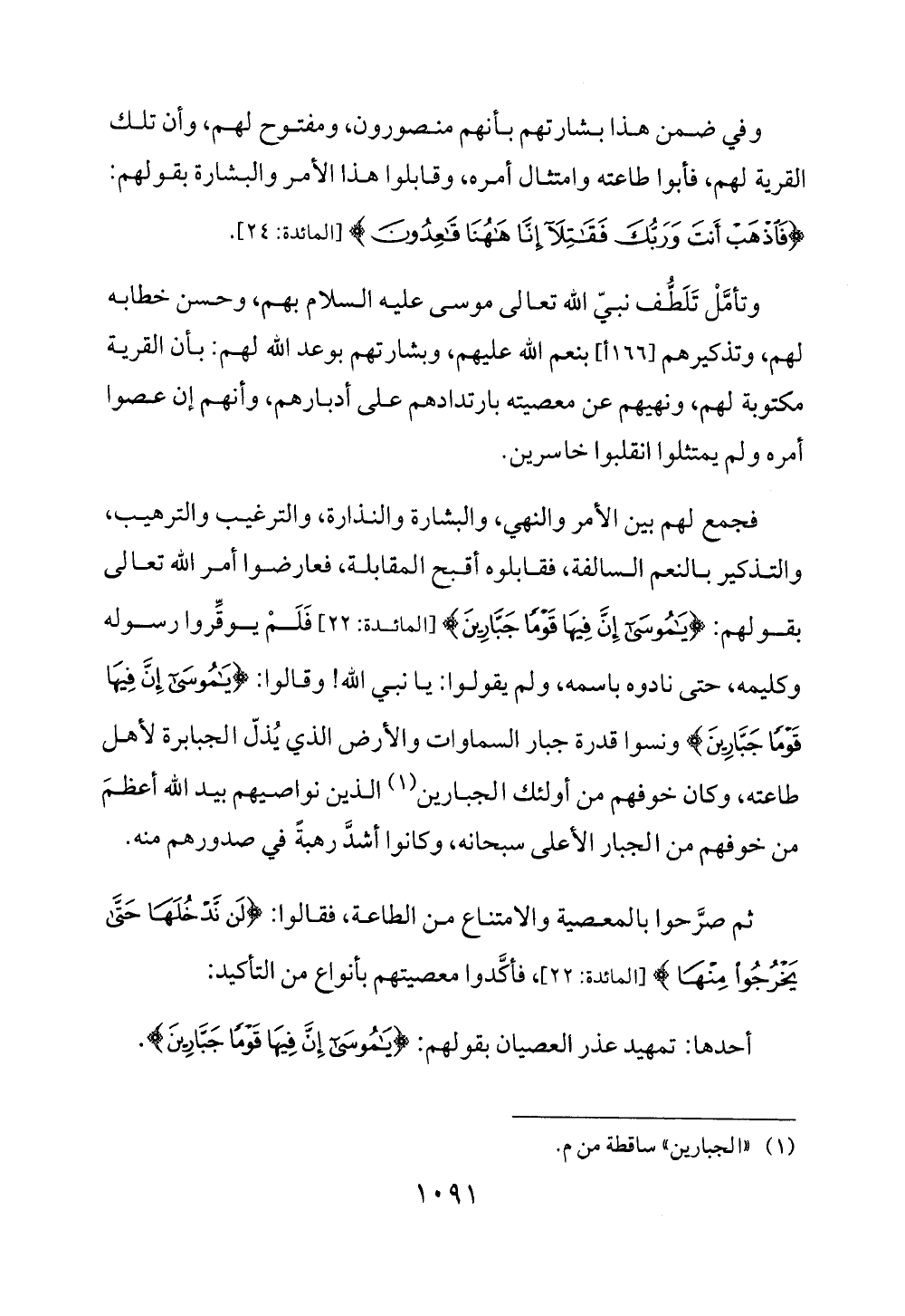 وفي ضمن هذا بشارتهم بأنهم منصورون، ومفتوح لهم، وأن تلك القرية لهم، فأبوا طاعته وامتثال أمره، وقابلوا هذا الأمر والبشارة بقولهم: {فَاذْهَبْ أَنْتَ وَرَبُّكَ فَقَاتِلَا إِنَّا هَاهُنَا قَاعِدُونَ} [المائدة: 24].