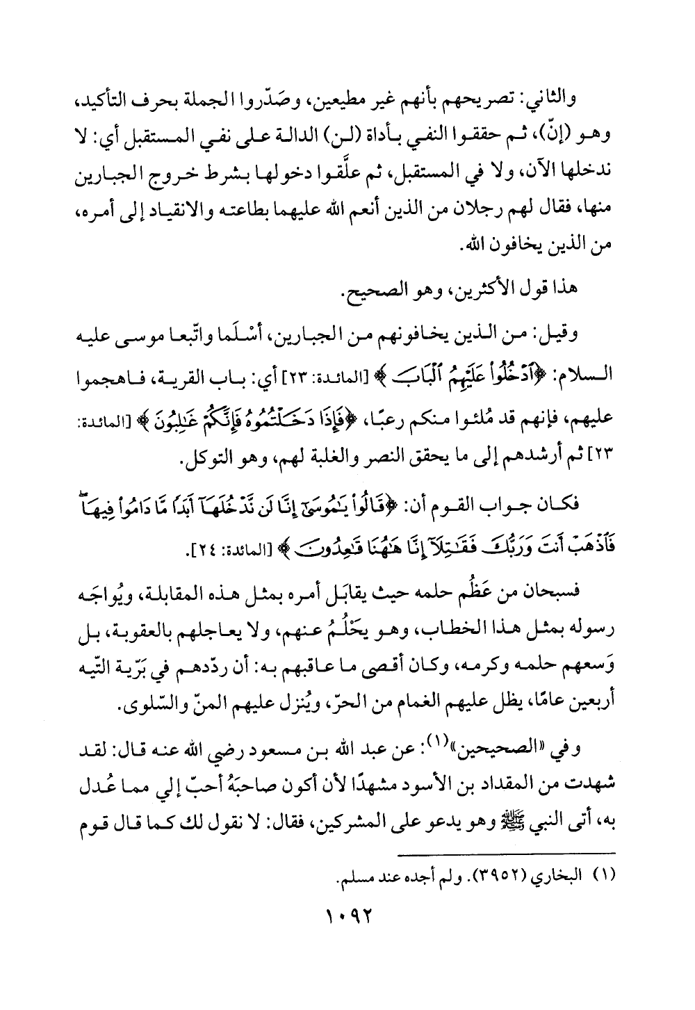 والثاني: تصريحهم بأنهم غير مطيعين، وصَدّروا الجملة بحرف التأكيد، وهو (إنّ)، ثم حققوا النفي بأداة (لن) الدالة على نفي المستقبل أي: لا ندخلها الآن، ولا في المستقبل، ثم علَّقوا دخولها بشرط خروج الجبارين منها، فقال لهم رجلان من الذين أنعم الله عليهما بطاعته والانقياد إلى أمره، من الذين يخافون الله.