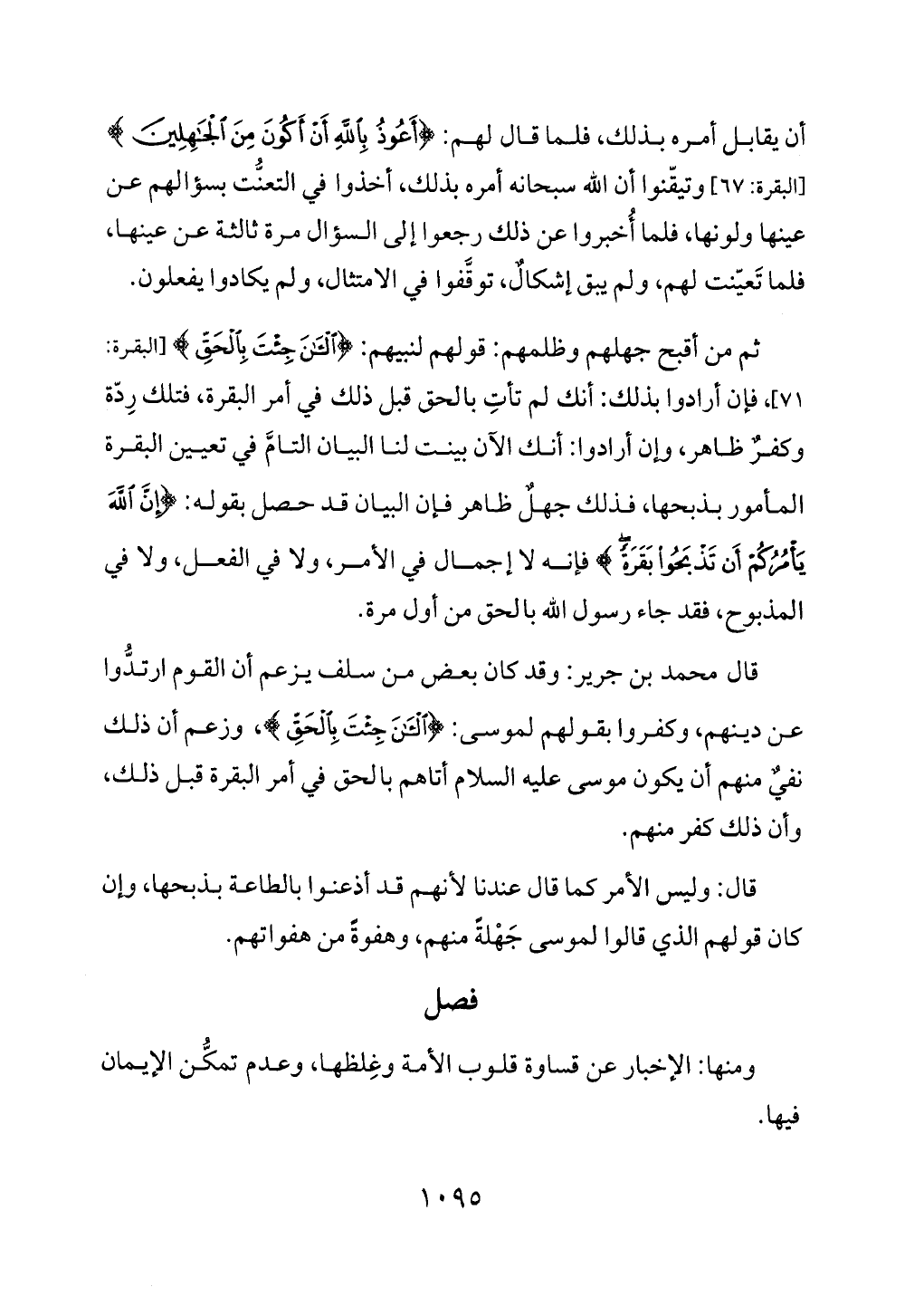 ثم من أقبح جهلهم وظلمهم: قولهم لنبيهم: {الْآنَ جِئْتَ بِالْحَقِّ} [البقرة: 71]، فإن أرادوا بذلك: أنك لم تأتِ بالحق قبل ذلك في أمر البقرة، فتلك رِدّة وكفرٌ ظاهر، وإن أرادوا: أنك الآن بينت لنا البيان التامَّ في تعيين البقرة المأمور بذبحها، فذلك جهلٌ ظاهر فإن البيان قد حصل بقوله: {إِنَّ اللَّهَ يَأْمُرُكُمْ أَنْ تَذْبَحُوا بَقَرَةً} فإنه لا إجمال في الأمر، ولا في الفعل، ولا في المذبوح، فقد جاء رسول الله بالحق من أول مرة.