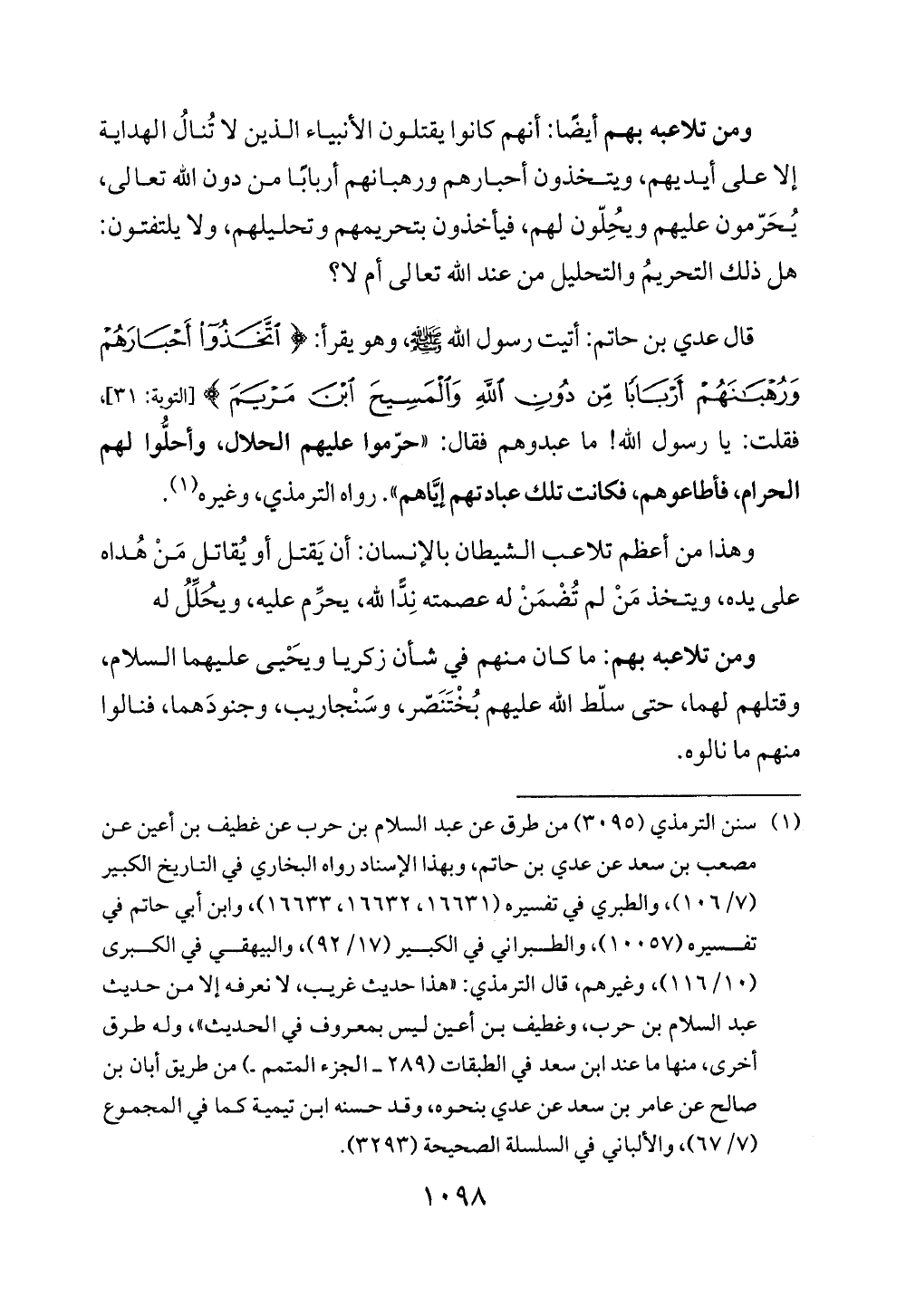 ومن تلاعبه بهم أيضًا: أنهم كانوا يقتلون الأنبياء الذين لا تُنالُ الهداية إلا على أيديهم، ويتخذون أحبارهم ورهبانهم أربابًا من دون الله تعالى، يُحَرّمون عليهم ويحُلّون لهم، فيأخذون بتحريمهم وتحليلهم، ولا يلتفتون: هل ذلك التحريمُ والتحليل من عند الله تعالى أم لا؟