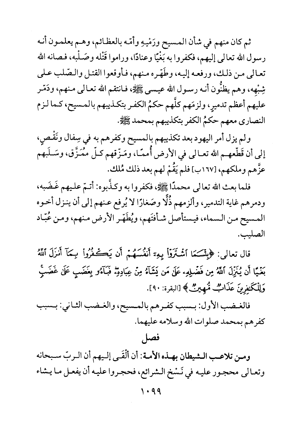 فلما بعث الله تعالى محمدًا - صلى الله عليه وسلم -، فكفروا به وكذَّبوه: أتمّ عليهم غَضَبه، ودمرهم غاية التدمير، وألزمهم ذُلًّا وصَغارًا لا يُرفع عنهم إلى أن ينزل أخوه المسيح من السماء، فيستأصل شأفتَهم، ويُطَهّر الأرض منهم، ومن عُبّاد الصليب.