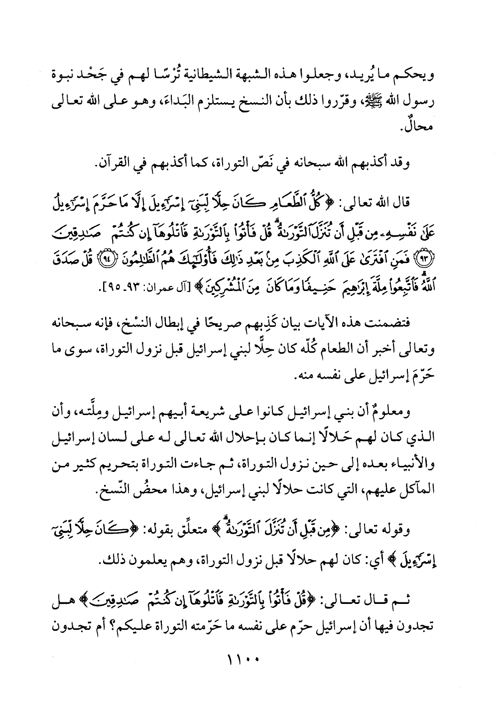 فتضمنت هذه الآيات بيان كَذِبهم صريحًا في إبطال النسْخ، فإنه سبحانه وتعالى أخبر أن الطعام كُلّه كان حِلًّا لبني إسرائيل قبل نزول التوراة، سوى ما حَرّمَ إسرائيل على نفسه منه.