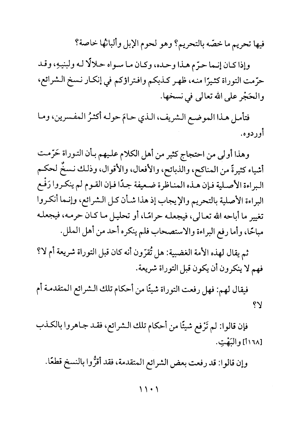 وهذا أولى من احتجاج كثير من أهل الكلام عليهم بأن التوراة حَرّمت أشياء كثيرةً من المناكح، والذبائح، والأفعال، والأقوال، وذلك نسخٌ لحكم البراءة الأصلية فإن هذه المناظرة ضعيفة جدًّا فإن القوم لم ينكروا رَفْع البراءة الأصلية بالتحريم والإيجاب إذ هذا شأن كل الشرائع، وإنما أنكروا تغيير ما أباحه الله تعالى، فيجعله حرامًا، أو تحليل ما كان حرمه، فيجعله مباحًا، وأما رفع البراءة والاستصحاب فلم ينكره أحد من أهل الملل.