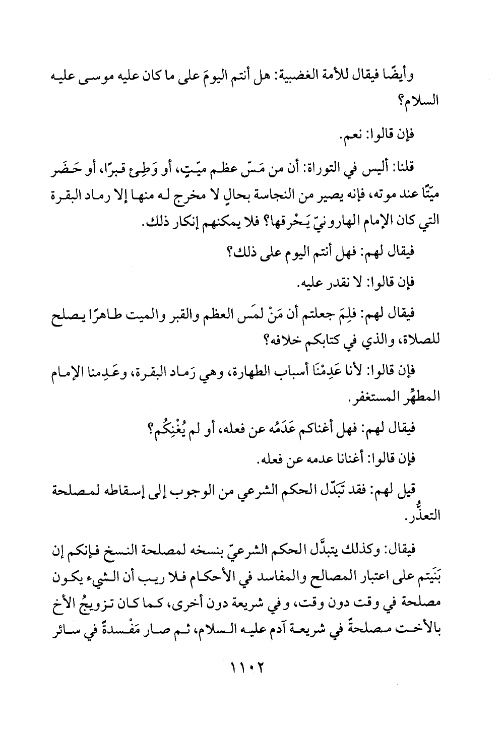 قلنا: أليس في التوراة: أن من مَسّ عظم ميّتٍ، أو وَطِئ قبرًا، أو حَضَر ميّتًا عند موته، فإنه يصير من النجاسة بحالٍ لا مخرج له منها إلا رماد البقرة التي كان الإمام الهارونيّ يَحْرقها؟ فلا يمكنهم إنكار ذلك.