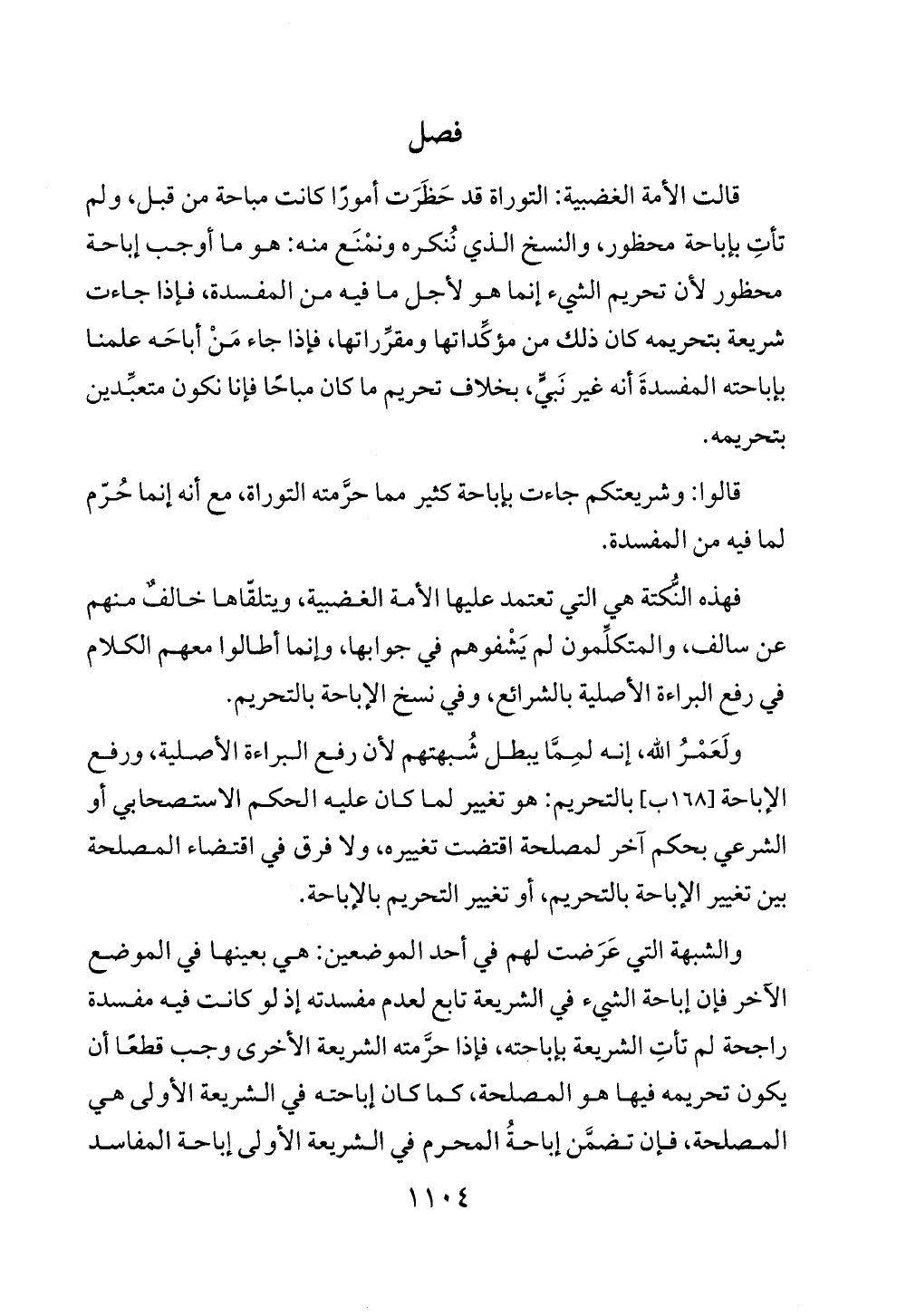 فهذه النكتة هي التي تعتمد عليها الأمة الغضبية، ويتلقّاها خالفٌ منهم عن سالف، والمتكلِّمون لم يَشْفوهم في جوابها، وإنما أطالوا معهم الكلام في رفع البراءة الأصلية بالشرائع، وفي نسخ الإباحة بالتحريم.