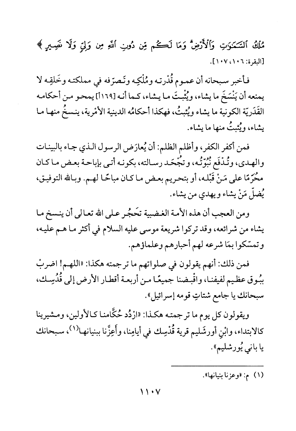 فأخبر سبحانه أن عموم قُدْرته ومُلْكِه وتَصرّفه في مملكته وخَلقِه لا يمنعه أن يَنْسَخَ ما يشاء، ويُثْبتَ ما يشاء، كما أنه [169 أ]، يمحو من أحكامه القَدَريّة الكونية ما يشاء ويُثبتُ، فهكذا أحكامُه الدينية الأمْرية، ينسخُ منها ما يشاء، ويُثبتُ منها ما يشاء.