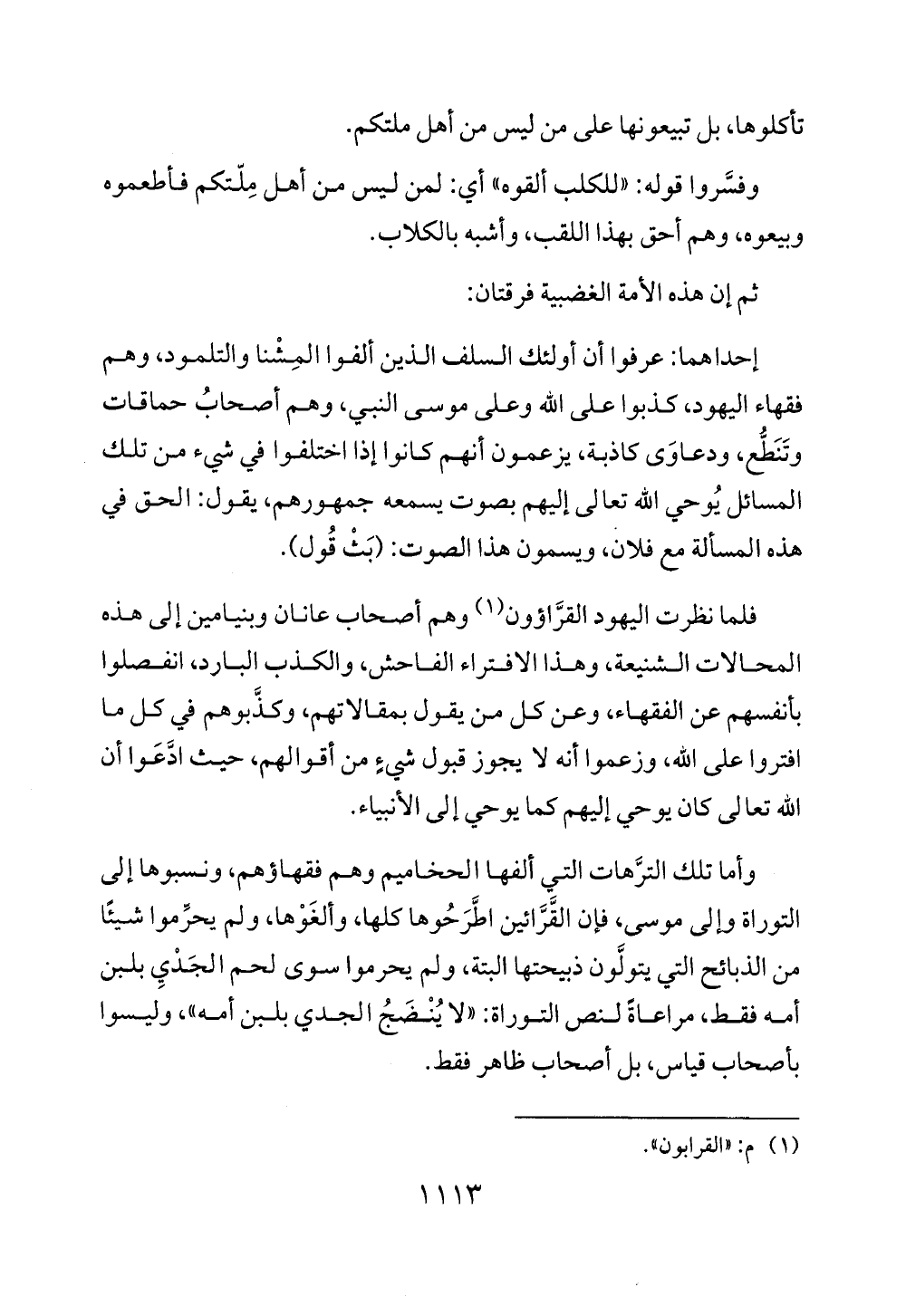 وأما تلك الترَّهات التي ألفها الحخاميم وهم فقهاؤهم، ونسبوها إلى التوراة وإلى موسى، فإن القَّرَّائين اطَّرَحُوها كلها، وألغَوْها، ولم يحرِّموا شيئًا من الذبائح التي يتولَّون ذبيحتها البتة، ولم يحرموا سوى لحم الجَدْيِ بلبن أمه فقط، مراعاةً لنص التوراة: "لا يُنْضَجُ الجدي بلبن أمه"، وليسوا بأصحاب قياس، بل أصحاب ظاهر فقط.
