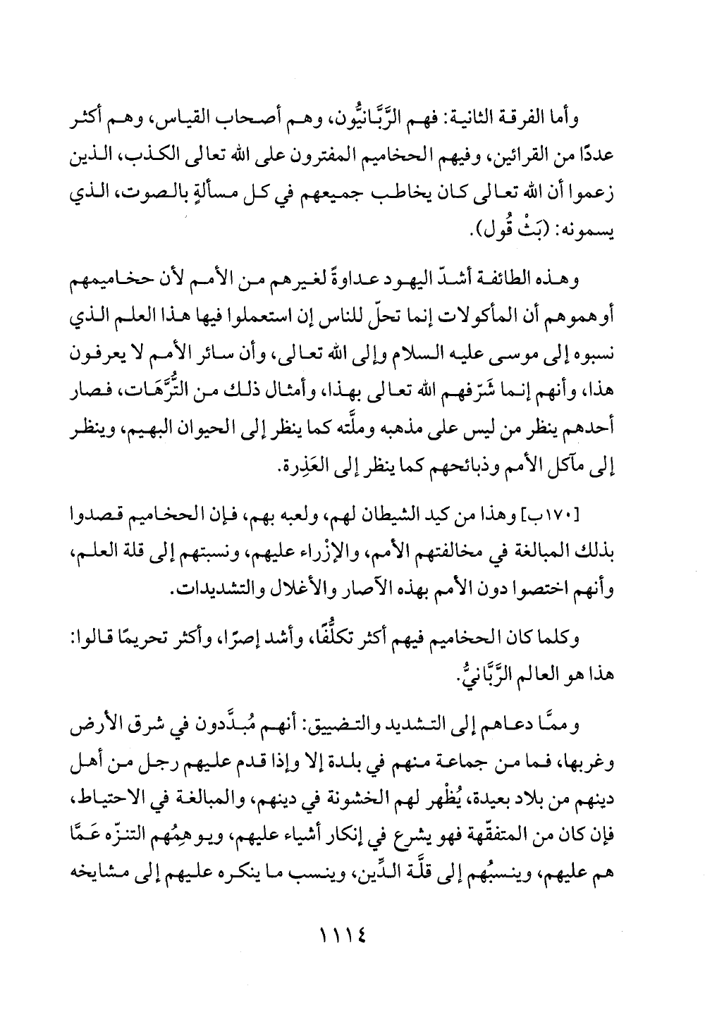 وأما الفرقة الثانية: فهم الرَّبَّانيُّون، وهم أصحاب القياس، وهم أكثر عددًا من القرائين، وفيهم الحخاميم المفترون على الله تعالى الكذب، الذين زعموا أن الله تعالى كان يخاطب جميعهم في كل مسألةٍ بالصوت، الذي يسمونه: (بَثْ قُول).
