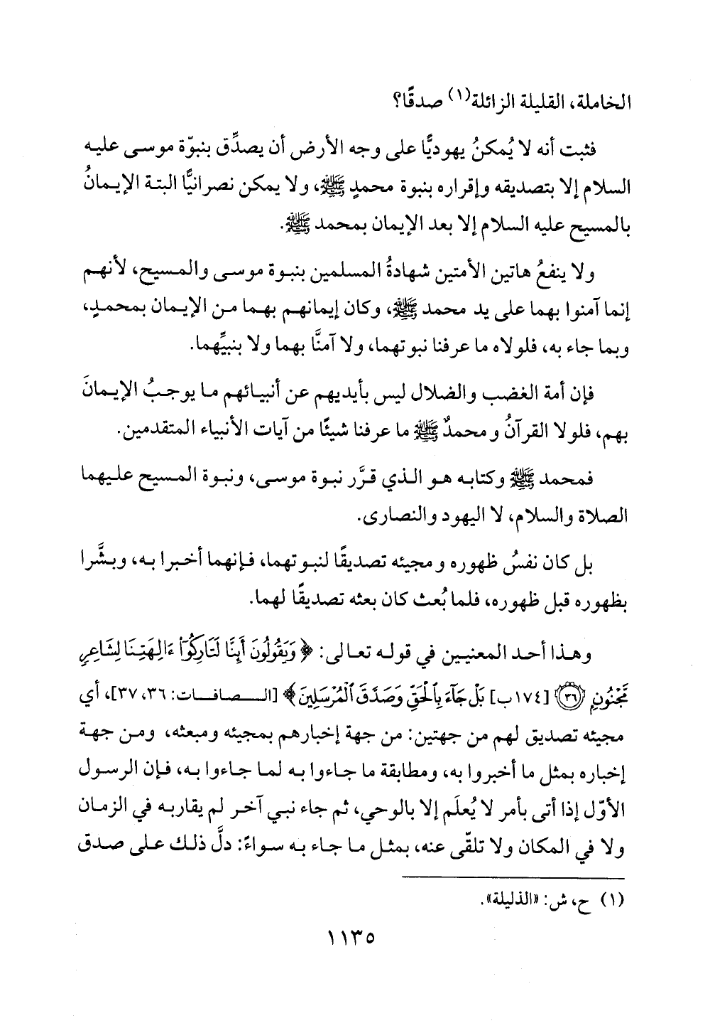 فثبت أنه لا يُمكنُ يهوديًّا على وجه الأرض أن يصدِّق بنبوّة موسى عليه السلام إلا بتصديقه وإقراره بنبوة محمدٍ - صلى الله عليه وسلم -، ولا يمكن نصرانيًّا البتة الإيمانُ بالمسيح عليه السلام إلا بعد الإيمان بمحمد - صلى الله عليه وسلم -.