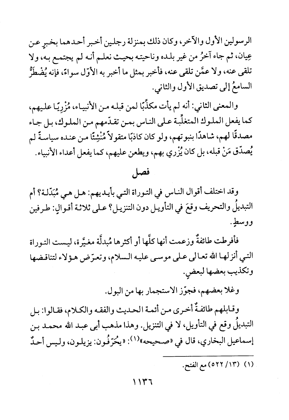 وقابلهم طائفةٌ أخرى من أئمة الحديث والفقه والكلام، فقالوا: بل التبديلُ وقع في التأويل، لا في التنزيل. وهذا مذهب أبي عبد الله محمد بن إسماعيل البخاري، قال في "صحيحه" (¬1): "يحرّفُون: يزيلون، وليس أحدٌ