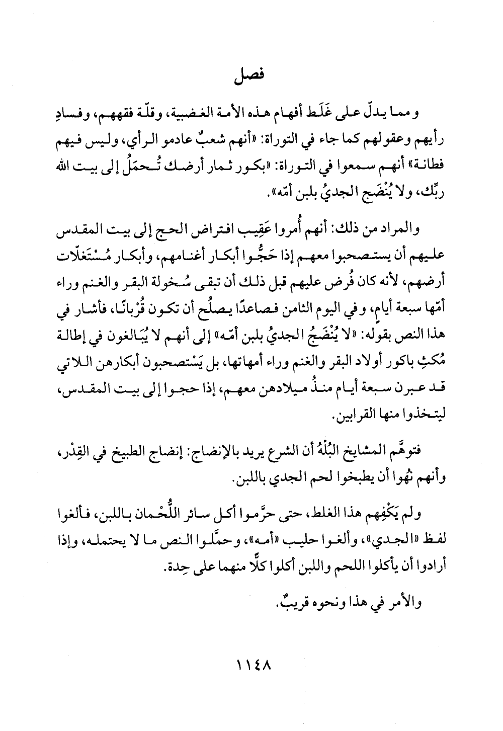 فتوهَّم المشايخ البُلْهُ أن الشرع يريد بالإنضاج: إنضاج الطبيخ في القِدْر، وأنهم نُهوا أن يطبخوا لحم الجدي باللبن.