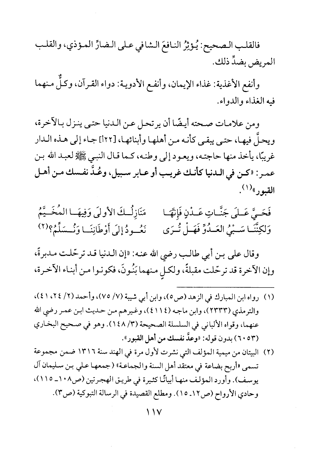 (¬2) البيتان من ميمية المؤلف التي نشرت لأول مرة في الهند سنة 1316 ضمن مجموعة تسمى "أربح بضاعة في معتقد أهل السنة والجماعة" (جمعها علي بن سليمان آل يوسف). وأورد المؤلف منها أبياتًا كثيرة في طريق الهجرتين (ص 108 - 115)، وحادي الأرواح (ص 12 - 15). ومطلع القصيدة في الرسالة التبوكية (ص 3).