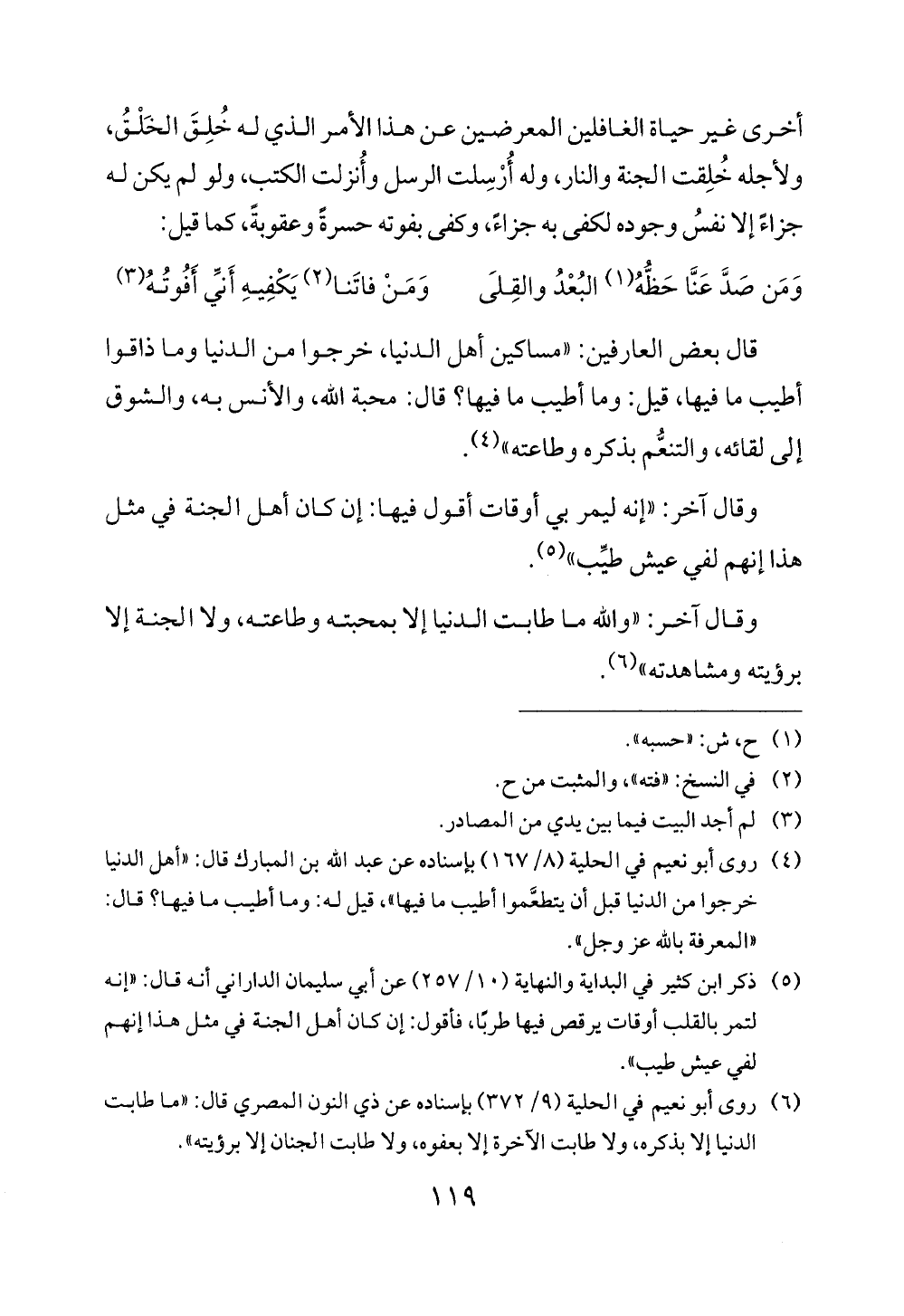 (¬6) روى أبو نعيم في الحلية (9/ 372) بإسناده عن ذي النون المصري قال: "ما طابت الدنيا إلا بذكره، ولا طابت الآخرة إلا بعفوه، ولا طابت الجنان إلا برؤيته".