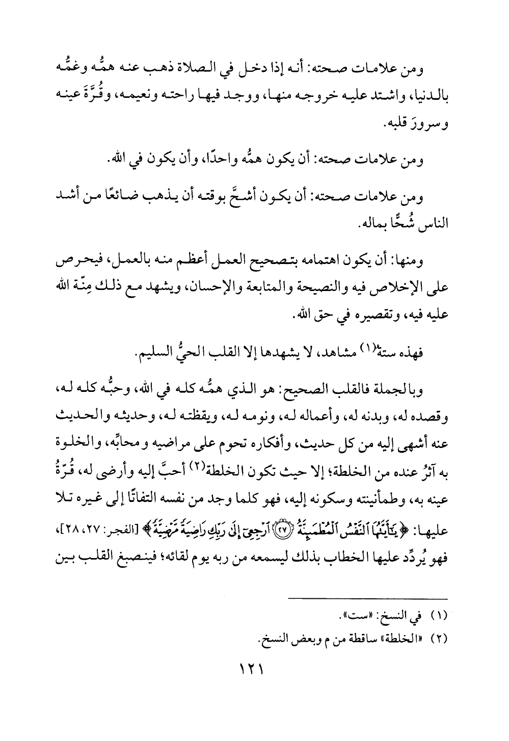وبالجملة فالقلب الصحيح: هو الذي همُّه كله في الله، وحبُّه كله له، وقصده له، وبدنه له، وأعماله له، ونومه له، ويقظته له، وحديثه والحديث عنه أشهى إليه من كل حديث، وأفكاره تحوم على مراضيه ومحابِّه، والخلوة به اَثرُ عنده من الخلطة؛ إلا حيث تكون الخلطة (¬2) أحبَّ إليه وأرضى له، قُرّةُ عينه به، وطمأنينته وسكونه إليه، فهو كما وجد من نفسه التفاتًا إلى غيره تلا عليها: {يَاأَيَّتُهَا النَّفْسُ الْمُطْمَئِنَّةُ (27) ارْجِعِي إِلَى رَبِّكِ رَاضِيَةً مَرْضِيَّةً} [الفجر: 27، 28] , فهو يُردِّد عليها الخطاب بذلك ليسمعه من ربه يوم لقائه؛ فينصبغ القلب بين