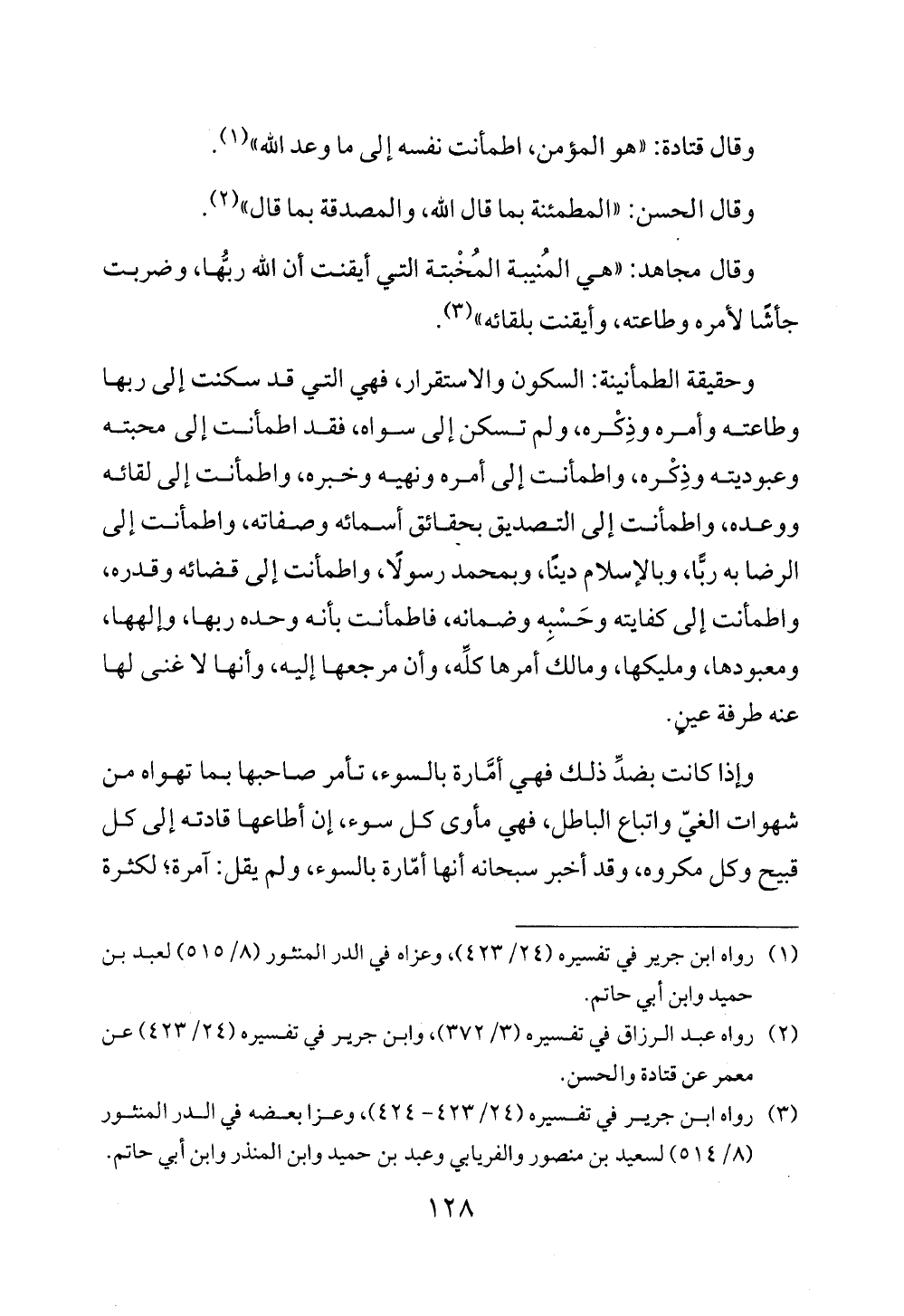 وحقيقة الطمأنينة: السكون والاستقرار، فهي التي قد سكنت إلى ربها وطاعته وأمره وذِكْره، ولم تسكن إلى سواه، فقد اطمأنت إلى محبته وعبوديته وذِكْره، واطمأنت إلى أمره ونهيه وخبره، واطمأنت إلى لقائه ووعده، واطمأنت إلى التصديق بحقائق أسمائه وصفاته، واطمأنت إلى الرضا به ربًّا، وبالإِسلام دينًا، وبمحمد رسولاً، واطمأنت إلى قضائه وقدره، واطمأنت إلى كفايته وحَسْبِه وضمانه، فاطمأنت بأنه وحده ربها، وإلهها، ومعبودها، ومليكها، ومالك أمرها كله، وأن مرجعها إليه، وأنها لا غنى لها عنه طرفة عينٍ.