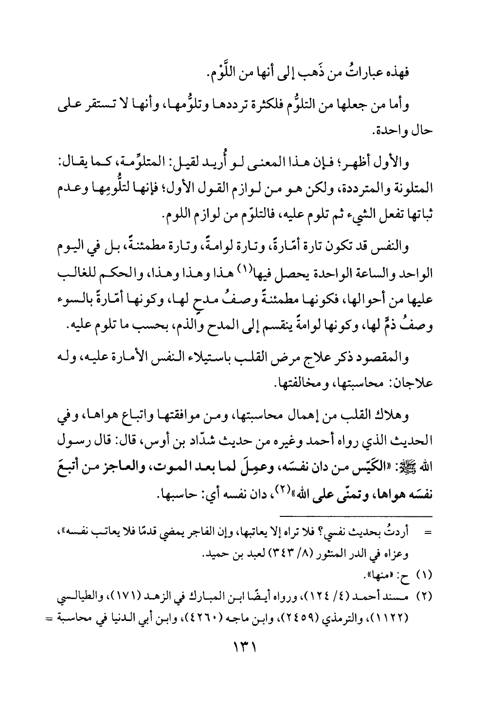 وهلاك القلب من إهمال محاسبتها، ومن موافقتها واتباع هواها، وفي الحديث الذي رواه أحمد وغيره من حديث شدّاد بن أوس، قال: قال رسول الله - صلى الله عليه وسلم -: "الكَيّس من دان نفسَه، وعمِلَ لما بعد الموت، والعاجز من أتبعَ نفسَه هواها، وتمنّى على الله" (¬2)، دان نفسه أي: حاسبها.