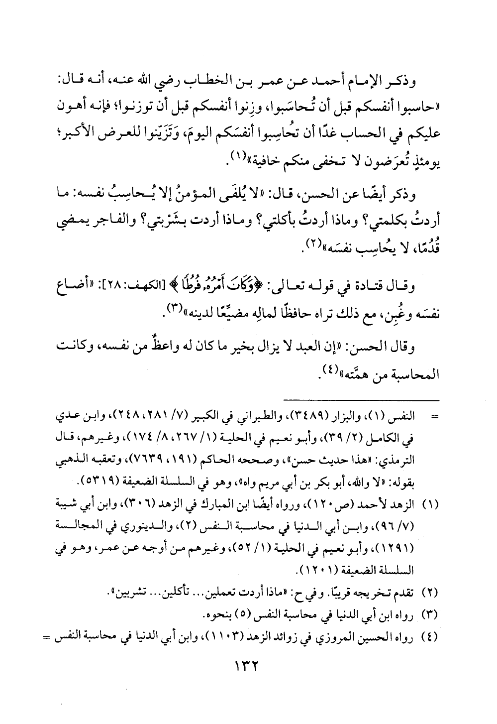 (¬1) الزهد لأحمد (ص 120)، ورواه أيضًا ابن المبارك في الزهد (306)، وابن أبي شيبة (7/ 96)، وابن أبي الدنيا في محاسبة النفس (2)، والدينوري في المجالسة (1291)، وأبو نعيم في الحلية (1/ 52)، وغيرهم من أوجه عن عمر، وهو في السلسلة الضعيفة (1201).