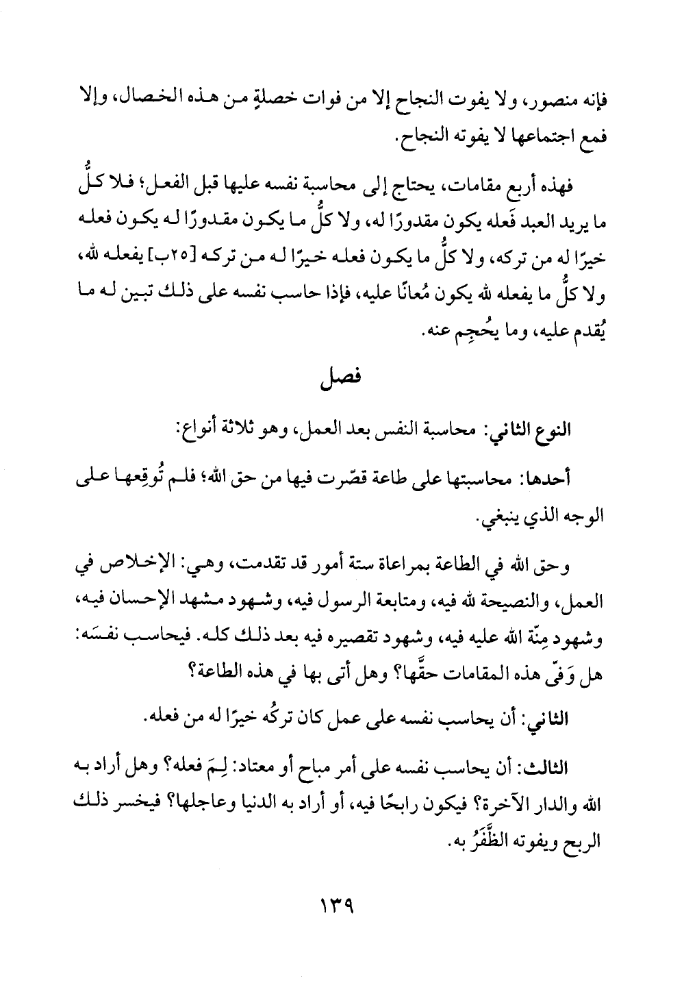 فهذه أربع مقامات، يحتاج إلى محاسبة نفسه عليها قبل الفعل؛ فلا كلُّ ما يريد العبد فعله يكون مقدوراً له، ولا كلُّ ما يكون مقدوراً له يكون فعله خيراً له من تركه، ولا كلُّ ما يكون فعله خيراً له من تركه [25 ب] يفعله لله، ولاكلُّ ما يفعله لله يكون مُعاناً عليه، فإذا حاسب نفسه على ذلك تبين له ما يُقدم عليه، وما يحُجِم عنه.