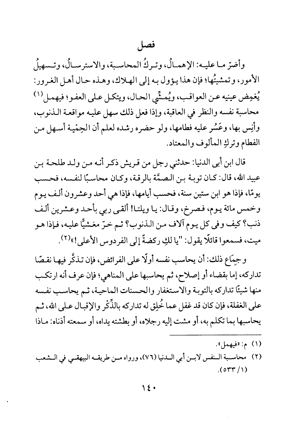 وجِمَاع ذلك: أن يحاسب نفسه أولاً على الفرائض، فإن تذكَّر فيها نقصاً تداركه، إما بقضاء أو إصلاح، ثمَّ يحاسبها على المناهي؛ فإن عرف أنه ارتكب منها شيئاً تداركه بالتوبة والاستغفار والحسنات الماحية، ثم يحاسب نفسه على الغفلة، فإن كان قد غفل عما خُلِق له تداركه بالذِّكْر والإقبال على الله، ثمَّ يحاسبها بما تكلم به، أو مشت إليه رجلاه، أو بطشته يداه، أو سمعته أذناه: ماذا