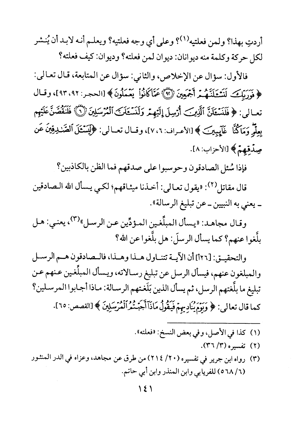 فالأول: سؤال عن الإخلاص، والثاني: سؤال عن المتابعة، قال تعالي: {فَوَرَبِّكَ لَنَسْأَلَنَّهُمْ أَجْمَعِينَ (92) عَمَّا كَانُوا يَعْمَلُونَ} [الحجر: 92، 93]، وقال تعالى: {فَلَنَسْأَلَنَّ الَّذِينَ أُرْسِلَ إِلَيْهِمْ وَلَنَسْأَلَنَّ الْمُرْسَلِينَ (6) فَلَنَقُصَّنَّ عَلَيْهِمْ بِعِلْمٍ وَمَا كُنَّا غَائِبِينَ} [الأعراف: 6، 7] وقال تعالى: {لِيَسْأَلَ الصَّادِقِينَ عَنْ صِدْقِهِمْ} [الأحزاب: 8]