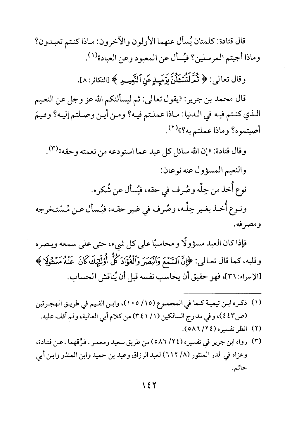 قال محمد بن جرير: "يقول تعالى: ثم ليسألنكم الله عز وجل عن النعيم الذي كنتم فيه في الدنيا: ماذا عملتم فيه؟ ومن أين وصلتم إليه؟ وفيمَ أصبتموه؟ وماذا عملتم به؟ " (¬2).