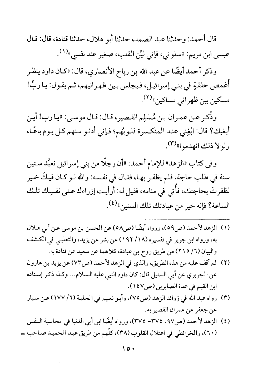 (¬4) الزهد لأحمد (ص 97، 374 - 375)، ورواه أيضاً ابن أبي الدنيا في محاسبة النفس (60)، والخرائطي في اعتلال القلوب (38)، كلّهم من طريق عبد الحميد صاحب =