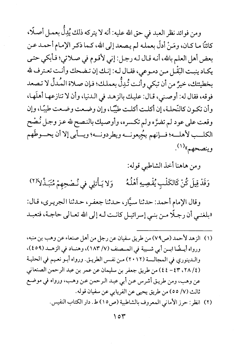 ومن فوائد نظر العبد في حق الله عليه: أنه لا يتركه ذلك يُدِلُّ بعمل أصلاً، كائناً ما كان، ومَنْ أدلّ بعمله لم يصعد إلى الله، كما ذكر الإمام أحمد عن بعض أهل العلم بالله، أنه قال له رجل: إني لأقوم في صلاتي؛ فأبكي حتى يكاد ينبت البَقْل من دموعي، فقال له: إنك إن تضحك وأنت تعترف لله بخطيئتك، خيرٌ من أن تبكي وأنت تُدِلُّ بعملك؛ فإن صلاة المُدلِّ لا تصعد فوقه، فقال له: أوصني، قال: عليك بالزهد في الدنيا، وأن لا تنازعها أهلَها، وأن تكون كالنّحلة، إن أكلت أكلت طيبا، وإن وضعت وضعت طيباً، وإن وقعت على عود لم تضرَّه ولم تكسره، وأوصيك بالنصح لله عز وجل نُصْح الكلب لأهله؛ فإنهم يجُيعونه ويطردونه؛ ويأبى إلا أن يحوطَهم وينصحهم" (¬1).