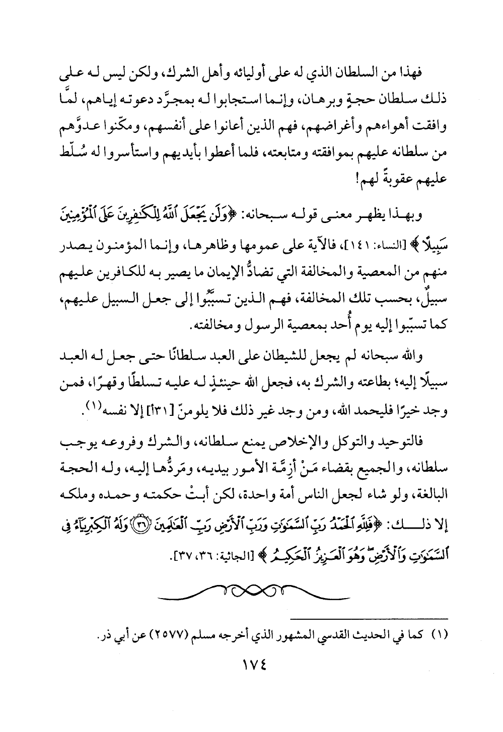 فالتوحيد والتوكل والإخلاص يمنع سلطانه، والشرك وفروعه يوجب سلطانه، والجميع بقضاء مَنْ أزِمَّة الأمور بيديه، ومَردُّها إليه، وله الحجة البالغة، ولو شاء لجعل الناس أمة واحدة، لكن أبتْ حكمته وحمده وملكه إلا ذلك: {فَلِلَّهِ الْحَمْدُ رَبِّ السَّمَاوَاتِ وَرَبِّ الْأَرْضِ رَبِّ الْعَالَمِينَ (36) وَلَهُ الْكِبْرِيَاءُ فِي السَّمَاوَاتِ وَالْأَرْضِ وَهُوَ الْعَزِيزُ الْحَكِيمُ} [الجاثية: 37، 36].