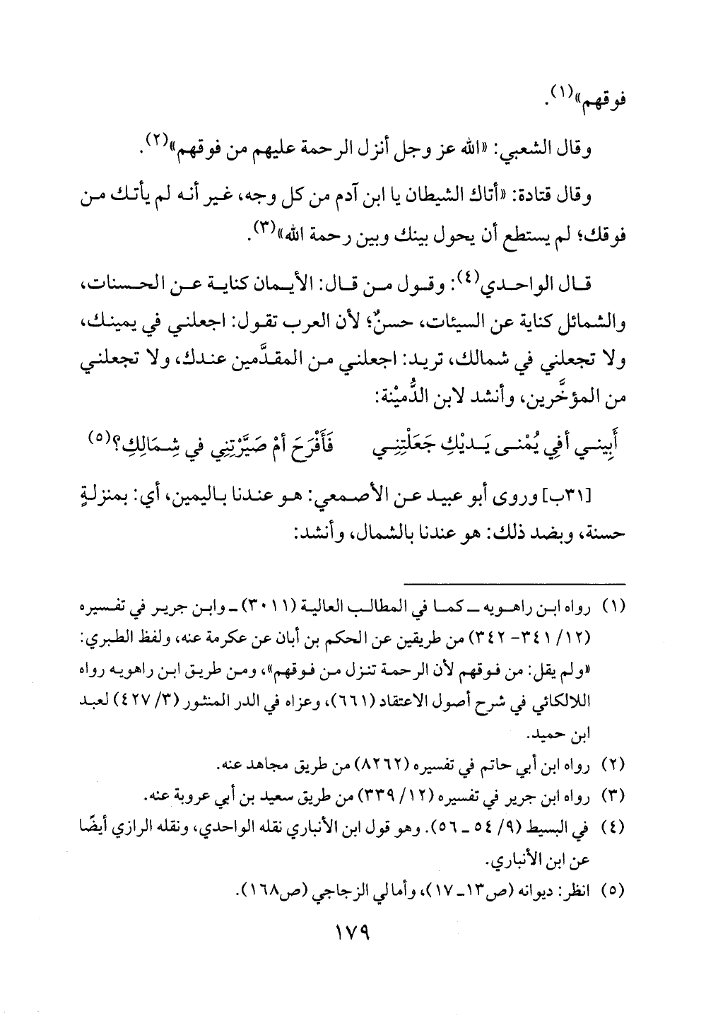 (¬1) رواه ابن راهويه -كما في المطالب العالية (3011) - وابن جرير في تفسيره (12/ 341 - 342) من طريقين عن الحكم بن أبان عن عكرمة عنه، ولفظ الطبري: "ولم يقل: من فوقهم لأن الرحمة تنزل من فوقهم"، ومن طريق ابن راهويه رواه اللالكائي في شرح أصول الاعتقاد (661)، وعزاه في الدر المنثور (3/ 427) لعبد ابن حميد.