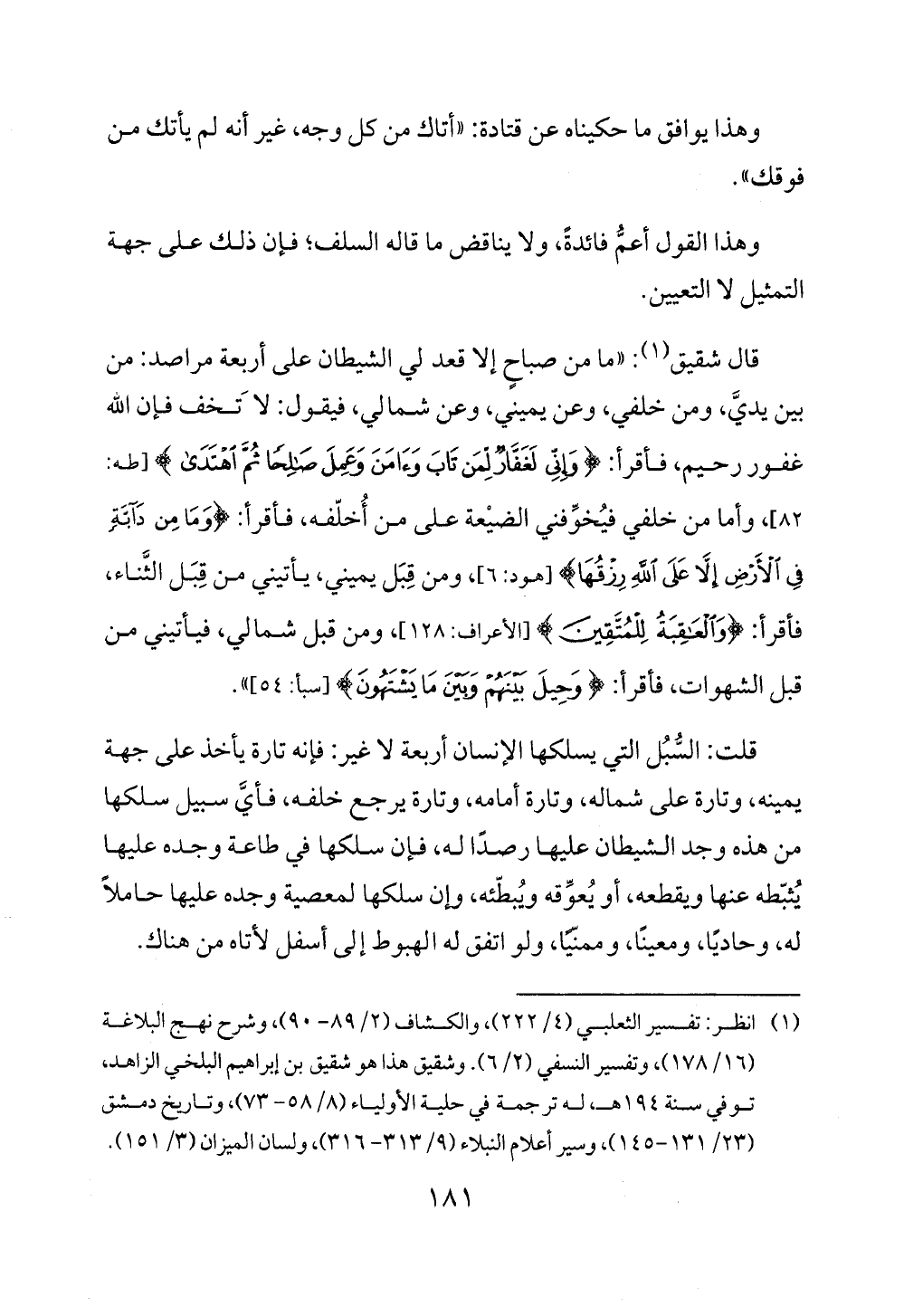 قال شقيق (¬1): "ما من صباحٍ إلا قعد لي الشيطان على أربعة مراصد: من بين يديَّ، ومن خلفي، وعن يميني، وعن شمالي، فيقول: لا تَخف فإن الله غفور رحيم، فاقرأ: {وَإِنِّي لَغَفَّارٌ لِمَنْ تَابَ وَآمَنَ وَعَمِلَ صَالِحًا ثُمَّ اهْتَدَى} [طه: 82]، وأما من خلفي فيُخوِّفني الضيْعة على من أُخلّفه، فأقرأ: {وَمَا مِنْ دَابَّةٍ فِي الْأَرْضِ إِلَّا عَلَى اللَّهِ رِزْقُهَا} [هود: 6]، ومن قِبَل يميني، يأتيني من قِبَل الثَّناء، فأقرأ: {وَالْعَاقِبَةُ لِلْمُتَّقِينَ} [الأعراف: 128]، ومن قبل من لي، فيأتيني من قبل الشهوات، فأقرأ: {وَحِيلَ بَيْنَهُمْ وَبَيْنَ مَا يَشْتَهُونَ} [سبأ: 54] ".