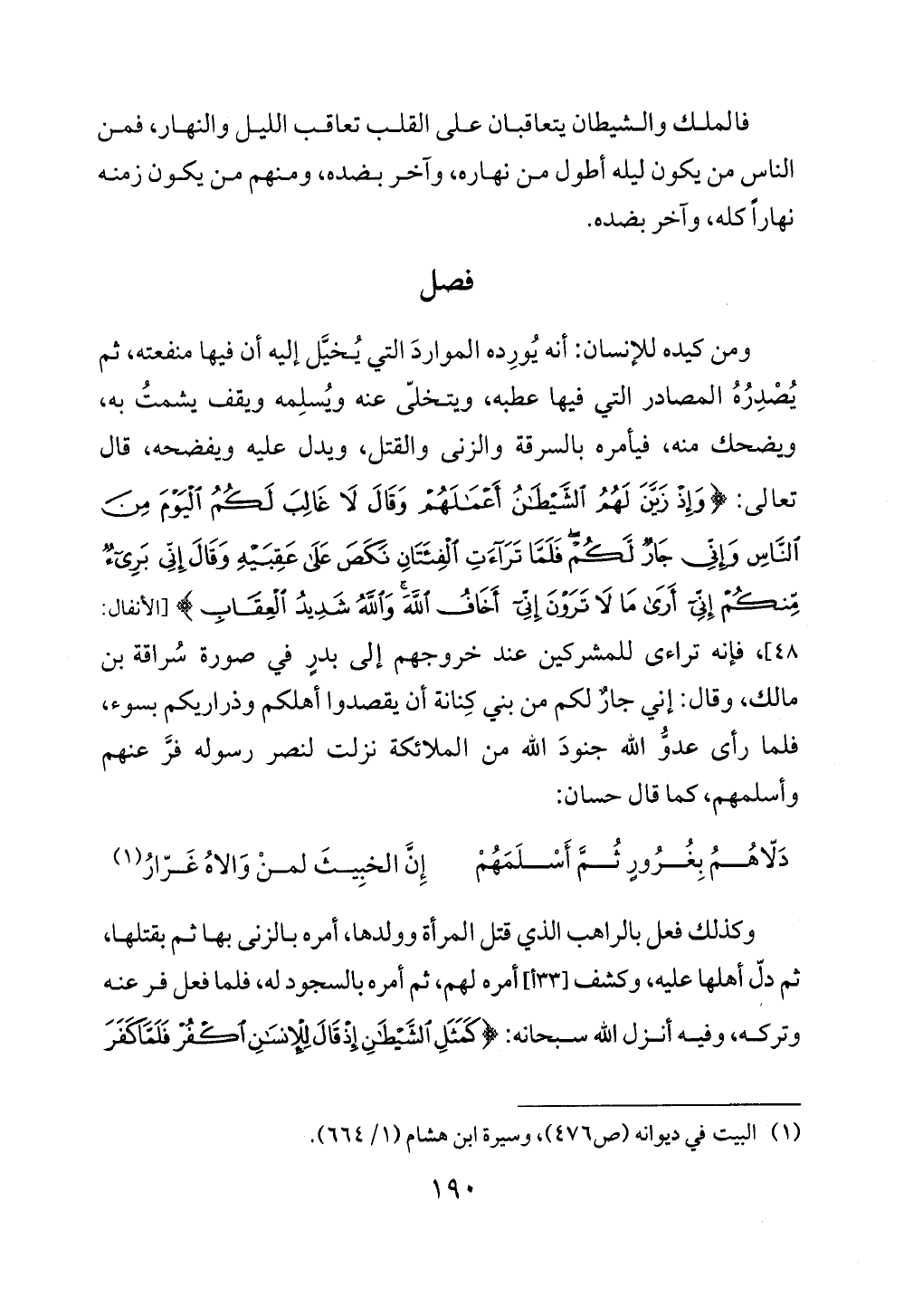 ومن كيده للإنسان: أنه يُورِده المواردَ التي يُخيَّل إليه أن فيها منفعته، ثم يُصْدِرُهُ المصادر التي فيها عطبه، ويتخلىّ عنه ويُسلِمه ويقف يشمتُ به، ويضحك منه، فيأمره بالسرقة والزنى والقتل، ويدل عليه ويفضحه، قال تعالى: {وَإِذْ زَيَّنَ لَهُمُ الشَّيْطَانُ أَعْمَالَهُمْ وَقَالَ لَا غَالِبَ لَكُمُ الْيَوْمَ مِنَ النَّاسِ وَإِنِّي جَارٌ لَكُمْ فَلَمَّا تَرَاءَتِ الْفِئَتَانِ نَكَصَ عَلَى عَقِبَيْهِ وَقَالَ إِنِّي بَرِيءٌ مِنْكُمْ إِنِّي أَرَى مَا لَا تَرَوْنَ إِنِّي أَخَافُ اللَّهَ وَاللَّهُ شَدِيدُ الْعِقَابِ} [الأنفال: 48]، فإنه تراءى للمشركين عند خروجهم إلى بدرٍ في صورة سُراقة بن مالك، وقال: إني جارٌ لكم من بني كِنانة أن يقصدوا أهلكم وذراريكم بسوء، فلما رأى عدوُّ الله جنودَ الله من الملائكة نزلت لنصر رسوله فرَّ عنهم وأسلمهم، كما قال حسان:
