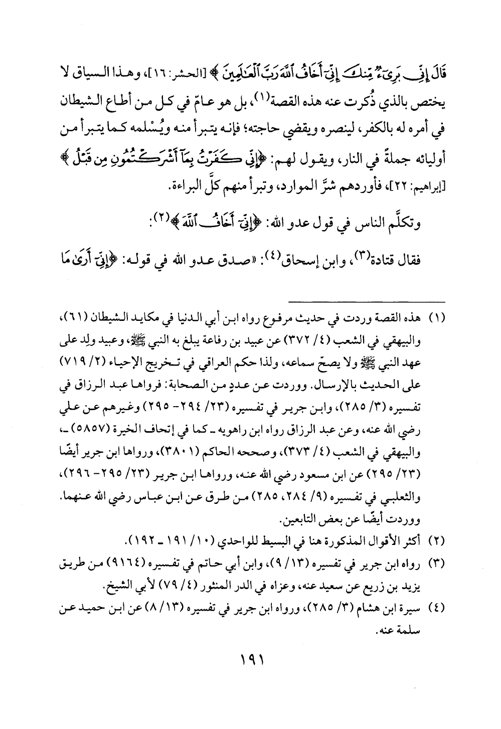 (¬1) هذه القصة وردت في حديث مرفوع رواه ابن أبي الدنيا في مكايد الشيطان (61)، والبيهقي في الشعب (4/ 372) عن عبيد بن رفاعة يبلغ به النبي - صلى الله عليه وسلم -، وعبيد ولد على عهد النبي - صلى الله عليه وسلم - ولا يصحّ سماعه، ولذا حكم العراقي في تخريج الإحياء (2/ 719) على الحديث بالإرسال. ووردت عن عددٍ من الصحابة: فرواها عبد الرزاق في تفسيره (3/ 285)، وابن جرير في تفسيره (23/ 294 - 295) وغيرهم عن علي رضي الله عنه، وعن عبد الرزاق رواه ابن راهويه -كما في إتحاف الخيرة (5857) -، والبيهقي في الشعب (4/ 373)، وصححه الحاكم (3801)، ورواها ابن جرير أيضًا (23/ 295) عن ابن مسعود رضي الله عنه، ورواها ابن جرير (23/ 295 - 296)، والثعلبي في تفسيره (9/ 284, 285) من طرق عن ابن عباس رضي الله عنهما. ووردت أيضًا عن بعض التابعين.