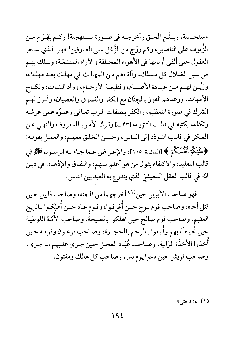 مستحسنة، وبشّع الحق وأخرجه في صورة مستهجنة! وكم بَهْرَج من الزُّيوف على الناقدين، وكم روّج من الزَّغل على العارفين! فهو الذي سحر العقول حتى ألقى أربابها في الأهواء المختلفة والآراء المتشعّبة؛ وسلك بهم من سبل الضلال كل مسلك، وألقاهم من المهالك في مهلك بعد مهلك، وزيَّن لهم من عبادة الأصنام، وقطيعة الأرحام، ووأد البنات، ونكاح الأمهات، ووعدهم الفوز بالجِنَان مع الكفر والفسوق والعصيان، وأبرز لهم الشرك في صورة التعظيم، والكفر بصفات الرب تعالى وعلوّه على عرشه وتكلمه بكتبه في قالب التنزيه، [33 ب] وترك الأمر بالمعروف والنهي عن المنكر في قالب التودّد إلى الناس، وحسن الخلق معهم، والعمل بقوله: {عَلَيْكُمْ أَنْفُسَكُمْ} [المائدة: 105]، والإعراض عما جاء به الرسول - صلى الله عليه وسلم - في قالب التقليد، والاكتفاء بقول من هو أعلم منهم، والنفاق والإدْهان في دين الله في قالب العقل المعيشيّ الذي يندرج به العبد بين الناس.